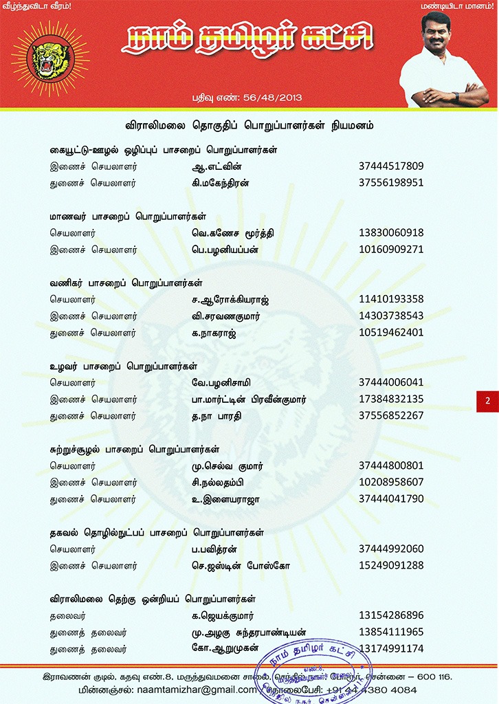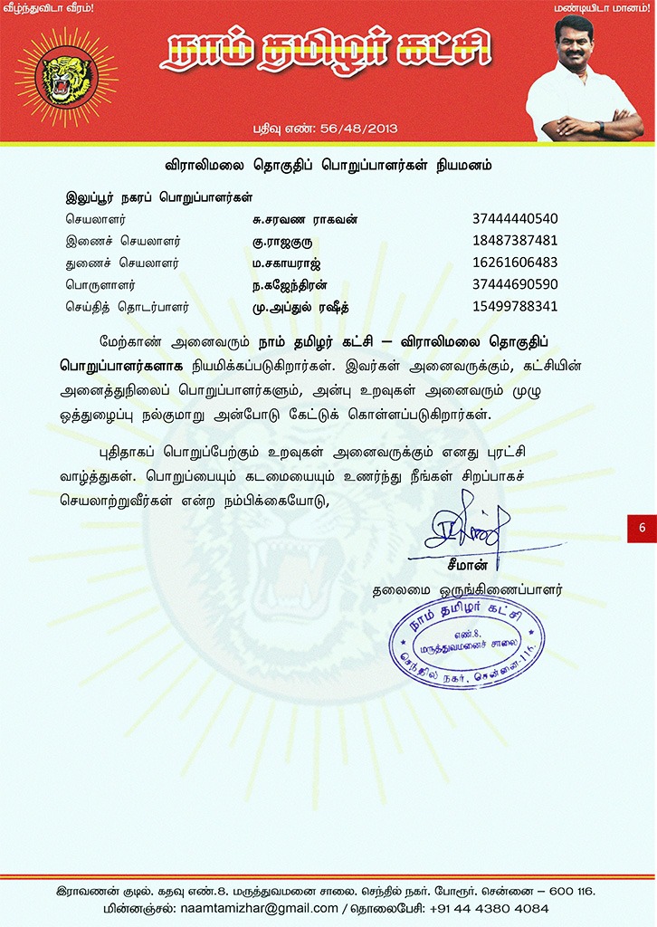 மேற்காண் அனைவரும் நாம் தமிழர் கட்சி – விராலிமலை தொகுதிப் பொறுப்பாளர்களாக நியமிக்கப்படுகிறார்கள். இவர்கள் அனைவருக்கும், கட்சியின் அனைத்துநிலைப் பொறுப்பாளர்களும், அன்பு உறவுகள் அனைவரும் முழு ஒத்துழைப்பு நல்குமாறு அன்போடு கேட்டுக் கொள்ளப்படுகிறார்கள்.