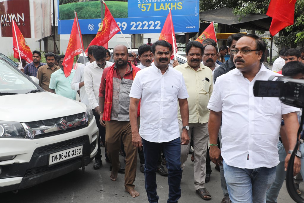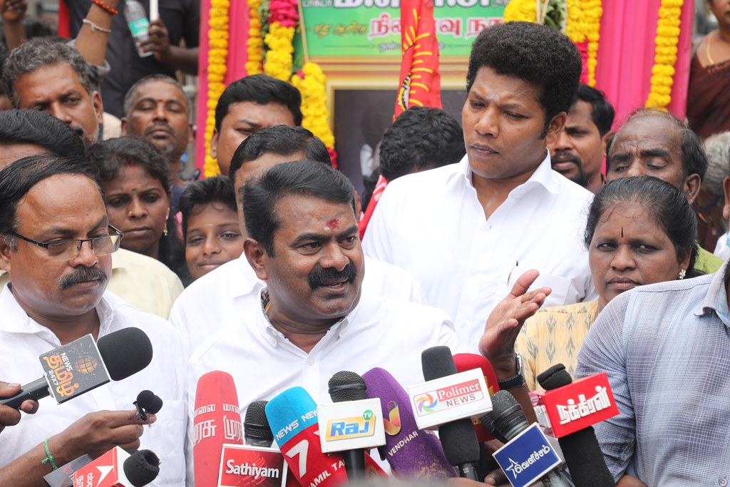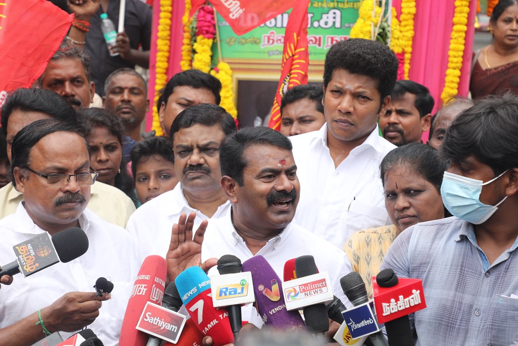 பின்னர் நடைபெற்ற செய்தியாளர் சந்திப்பில் சீமான் அவர்கள் கூறியதாவது, “தமிழக எல்லை மீட்புப் போராளி ‘சிலம்புச்செல்வர்’ என்று தமிழின மக்களால் அன்போடு அழைக்கப்படுகிற பெருந்தமிழர் ம.பொ.சி அவர்களின் நினைவைப் போற்றுகிற நாள் இன்று. ‘தமிழரசுக் கழகம்’ நடத்தி, எங்களைப் போன்ற அடுத்தத் தலைமுறை தமிழ் பிள்ளைகளுக்கு வழிகாட்டியாக வாழ்ந்த பெருந்தகை. அவருடைய சொற்பொழிவைக் கேட்கும்போது, தடையின்றித் தமிழ்த்தாய் அவர் நாவில் விளையாடுவதைப் பார்க்க முடியும். அப்படிபட்ட ஆற்றல் வாய்ந்தவர் ஐயா ம.பொ.சி அவர்கள். இந்நாளில் நாம் தமிழர் கட்சி சார்பாகவும், ஐயா ம.பொ.சி அவர்களுடைய குடும்பத்தினர் சார்பாகவும் தமிழக அரசுக்கு சில கோரிக்கைகளை முன்வைக்க விரும்புகிறோம். நீண்ட நாட்களாக நாங்கள் முன்வைக்கும் கோரிக்கைகளுள் ஒன்றானது, ஐயா ம.பொ.சி அவர்களுக்கு ஒரு மணிமண்டபம் கட்டுவது. இரண்டாவது, தாம்பரத்திற்கு அருகில் உருவாக இருக்கிற பேருந்து நிலையத்திற்கு ஐயா ம.பொ.சி அவர்களின் பெயரைச் சூட்டுவது. மூன்றாவது, தமிழக அரசு விருது வழங்கும்போது, இலக்கியத்தில் ஈடு இணையற்ற புகழ்பெற்ற, ‘சிலம்புச்செல்வர்’ என்று பாராட்டப்பெற்ற நமது ஐயா ம.பொ.சி அவர்களின் பெயரில் ஒரு விருது வழங்குவது என்ற மூன்று கோரிக்கைகளை அரசு கவனத்தில் எடுத்து, செயல்படுத்த வேண்டும் என்று நாம் தமிழர் கட்சி சார்பாகத் தமிழக அரசிற்கு முன்வைக்கின்றேன். பெருந்தமிழர் ம.பொ.சி அவர்களுடைய நினைவைப் போற்றுவதில் நாங்கள் பெருமை அடைகிறோம். நாம் தமிழர் பிள்ளைகள் அவருக்கு எங்களுடைய புகழ் வணக்கத்தைச் செலுத்துவதில் பெருமகிழ்ச்சி அடைகிறோம்” என்று தெரிவித்தார்.
