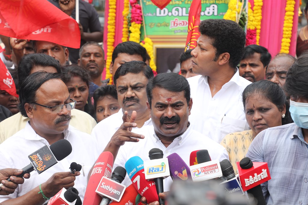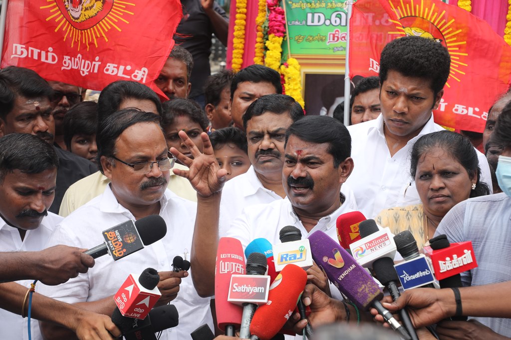 பின்னர் நடைபெற்ற செய்தியாளர் சந்திப்பில் சீமான் அவர்கள் கூறியதாவது, “தமிழக எல்லை மீட்புப் போராளி ‘சிலம்புச்செல்வர்’ என்று தமிழின மக்களால் அன்போடு அழைக்கப்படுகிற பெருந்தமிழர் ம.பொ.சி அவர்களின் நினைவைப் போற்றுகிற நாள் இன்று. ‘தமிழரசுக் கழகம்’ நடத்தி, எங்களைப் போன்ற அடுத்தத் தலைமுறை தமிழ் பிள்ளைகளுக்கு வழிகாட்டியாக வாழ்ந்த பெருந்தகை. அவருடைய சொற்பொழிவைக் கேட்கும்போது, தடையின்றித் தமிழ்த்தாய் அவர் நாவில் விளையாடுவதைப் பார்க்க முடியும். அப்படிபட்ட ஆற்றல் வாய்ந்தவர் ஐயா ம.பொ.சி அவர்கள். இந்நாளில் நாம் தமிழர் கட்சி சார்பாகவும், ஐயா ம.பொ.சி அவர்களுடைய குடும்பத்தினர் சார்பாகவும் தமிழக அரசுக்கு சில கோரிக்கைகளை முன்வைக்க விரும்புகிறோம். நீண்ட நாட்களாக நாங்கள் முன்வைக்கும் கோரிக்கைகளுள் ஒன்றானது, ஐயா ம.பொ.சி அவர்களுக்கு ஒரு மணிமண்டபம் கட்டுவது. இரண்டாவது, தாம்பரத்திற்கு அருகில் உருவாக இருக்கிற பேருந்து நிலையத்திற்கு ஐயா ம.பொ.சி அவர்களின் பெயரைச் சூட்டுவது. மூன்றாவது, தமிழக அரசு விருது வழங்கும்போது, இலக்கியத்தில் ஈடு இணையற்ற புகழ்பெற்ற, ‘சிலம்புச்செல்வர்’ என்று பாராட்டப்பெற்ற நமது ஐயா ம.பொ.சி அவர்களின் பெயரில் ஒரு விருது வழங்குவது என்ற மூன்று கோரிக்கைகளை அரசு கவனத்தில் எடுத்து, செயல்படுத்த வேண்டும் என்று நாம் தமிழர் கட்சி சார்பாகத் தமிழக அரசிற்கு முன்வைக்கின்றேன். பெருந்தமிழர் ம.பொ.சி அவர்களுடைய நினைவைப் போற்றுவதில் நாங்கள் பெருமை அடைகிறோம். நாம் தமிழர் பிள்ளைகள் அவருக்கு எங்களுடைய புகழ் வணக்கத்தைச் செலுத்துவதில் பெருமகிழ்ச்சி அடைகிறோம்” என்று தெரிவித்தார்.
