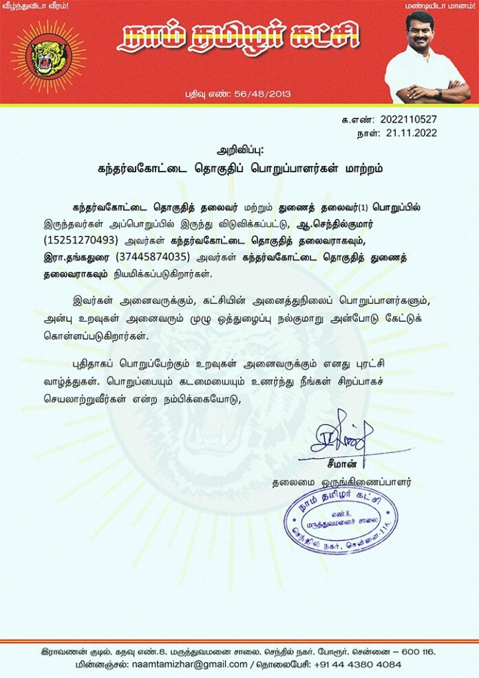 கந்தர்வகோட்டை தொகுதித் தலைவர் மற்றும் துணைத் தலைவர்(1) பொறுப்பில் இருந்தவர்கள் அப்பொறுப்பில் இருந்து விடுவிக்கப்பட்டு, ஆ.செந்தில்குமார் (15251270493) அவர்கள் கந்தர்வகோட்டை தொகுதித் தலைவராகவும், இரா.தங்கதுரை (37445874035) அவர்கள் கந்தர்வகோட்டை தொகுதித் துணைத் தலைவராகவும் நியமிக்கப்படுகிறார்கள்.