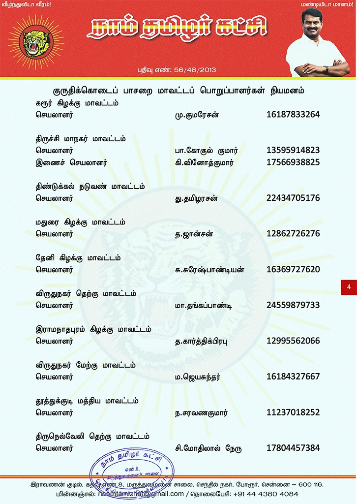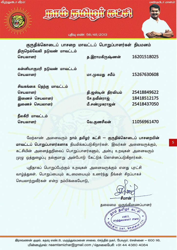 மேற்காண் அனைவரும் நாம் தமிழர் கட்சி – குருதிக்கொடைப் பாசறையின் மாவட்டப் பொறுப்பாளர்களாக நியமிக்கப்படுகிறார்கள். இவர்கள் அனைவருக்கும், கட்சியின் அனைத்துநிலைப் பொறுப்பாளர்களும், அன்பு உறவுகள் அனைவரும் முழு ஒத்துழைப்பு நல்குமாறு அன்போடு கேட்டுக் கொள்ளப்படுகிறார்கள்.