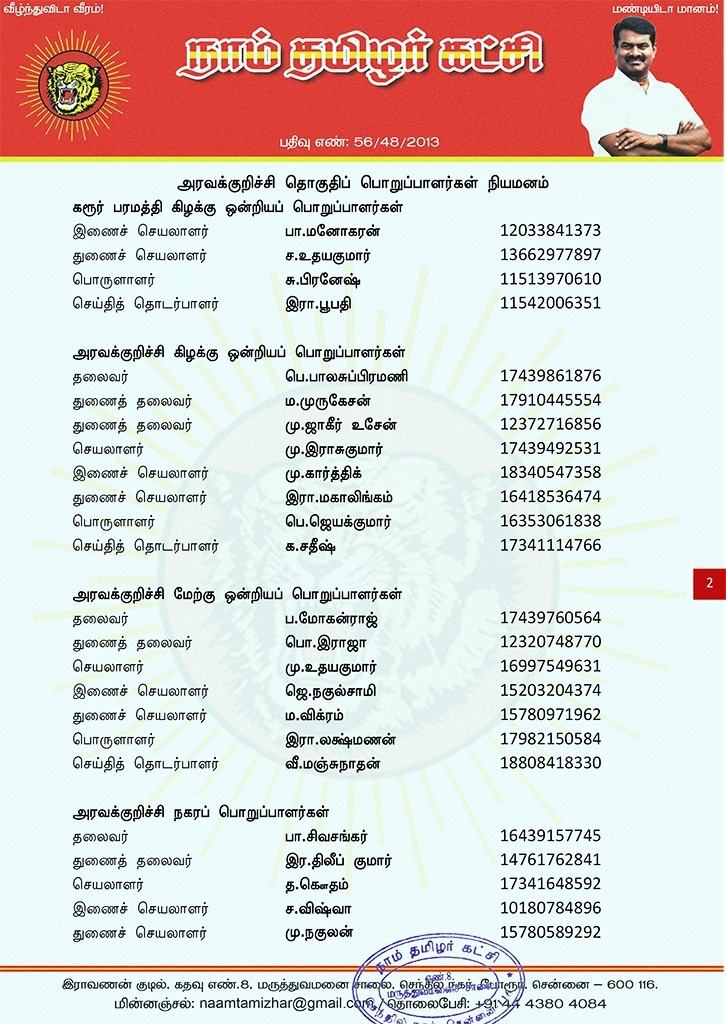 மேற்காண் அனைவரும் நாம் தமிழர் கட்சி – அரவக்குறிச்சி தொகுதிப் பொறுப்பாளர்களாக நியமிக்கப்படுகிறார்கள்.இவர்கள் அனைவருக்கும், கட்சியின் அனைத்துநிலைப் பொறுப்பாளர்களும், அன்பு உறவுகள் அனைவரும் முழு ஒத்துழைப்பு நல்குமாறு அன்போடு கேட்டுக் கொள்ளப்படுகிறார்கள்.
