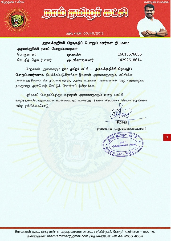 மேற்காண் அனைவரும் நாம் தமிழர் கட்சி – அரவக்குறிச்சி தொகுதிப் பொறுப்பாளர்களாக நியமிக்கப்படுகிறார்கள்.இவர்கள் அனைவருக்கும், கட்சியின் அனைத்துநிலைப் பொறுப்பாளர்களும், அன்பு உறவுகள் அனைவரும் முழு ஒத்துழைப்பு நல்குமாறு அன்போடு கேட்டுக் கொள்ளப்படுகிறார்கள்.