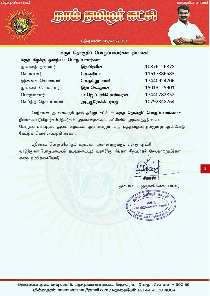 மேற்காண் அனைவரும் நாம் தமிழர் கட்சி – கரூர் தொகுதிப் பொறுப்பாளர்களாக நியமிக்கப்படுகிறார்கள்.இவர்கள் அனைவருக்கும், கட்சியின் அனைத்துநிலைப் பொறுப்பாளர்களும், அன்பு உறவுகள் அனைவரும் முழு ஒத்துழைப்பு நல்குமாறு அன்போடு கேட்டுக் கொள்ளப்படுகிறார்கள்.