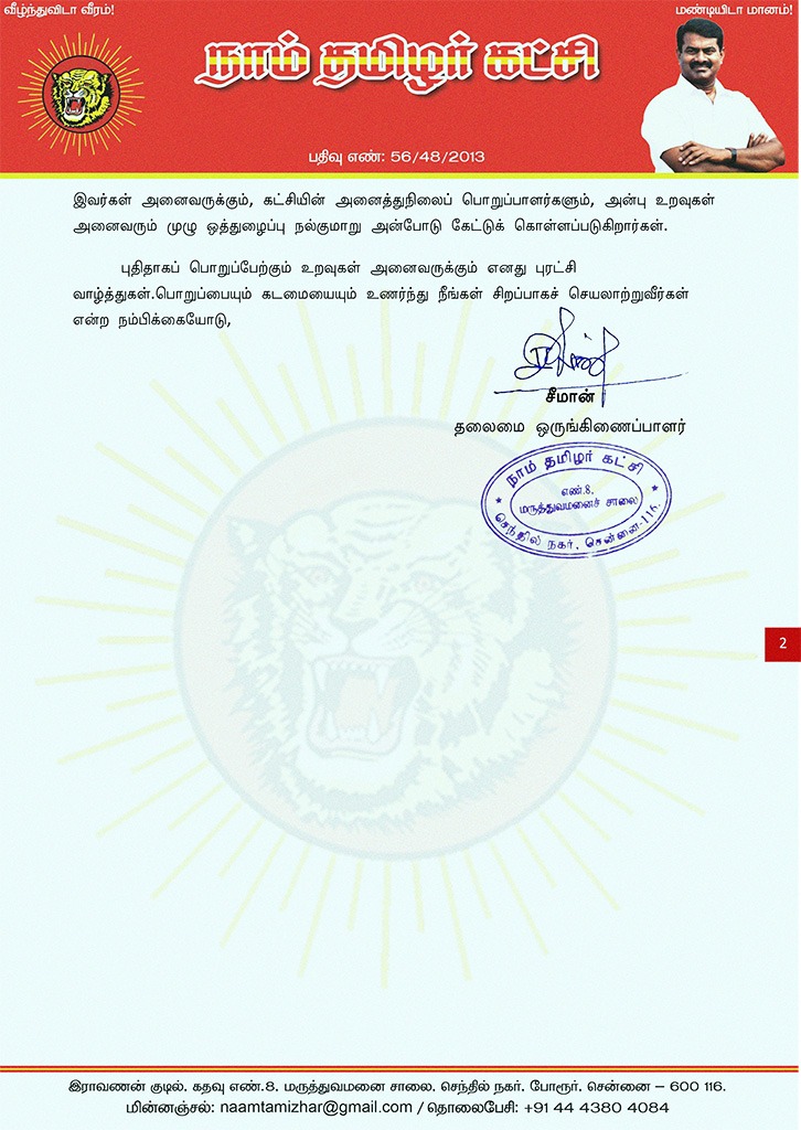 இவர்கள் அனைவருக்கும், கட்சியின் அனைத்துநிலைப் பொறுப்பாளர்களும், அன்பு உறவுகள் அனைவரும் முழு ஒத்துழைப்பு நல்குமாறு அன்போடு கேட்டுக் கொள்ளப்படுகிறார்கள்.