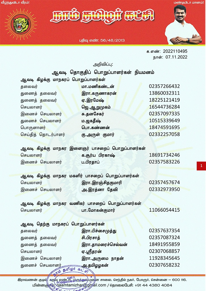 மேற்காண் அனைவரும் நாம் தமிழர் கட்சி – ஆவடி தொகுதிப் பொறுப்பாளர்களாக நியமிக்கப்படுகிறார்கள்.