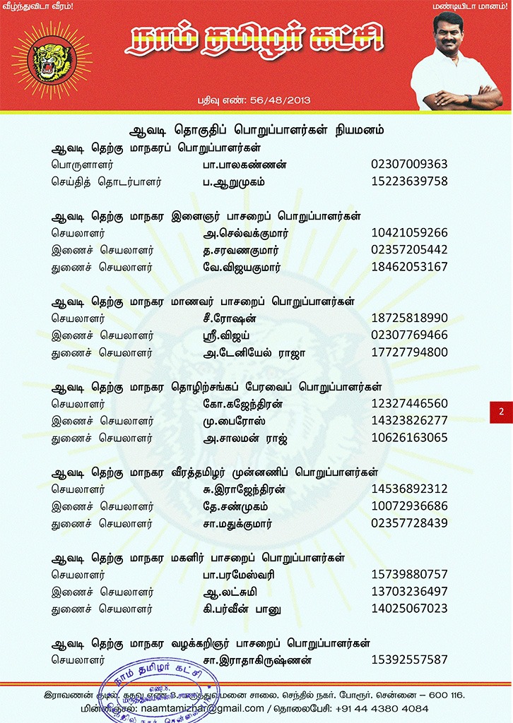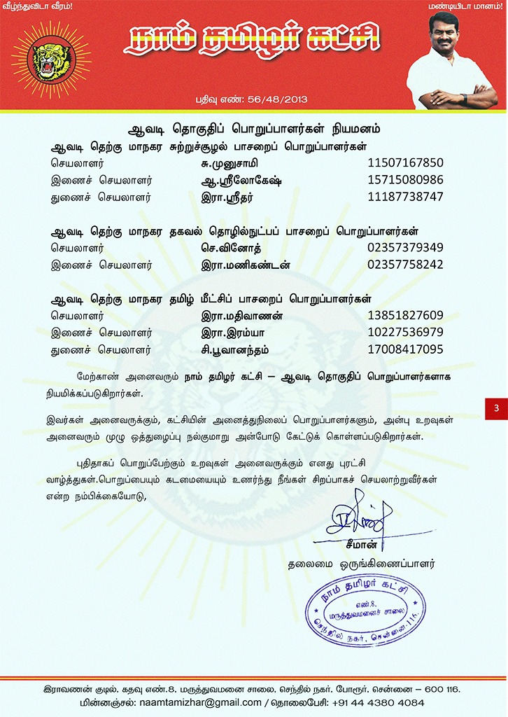 மேற்காண் அனைவரும் நாம் தமிழர் கட்சி – ஆவடி தொகுதிப் பொறுப்பாளர்களாக நியமிக்கப்படுகிறார்கள்.