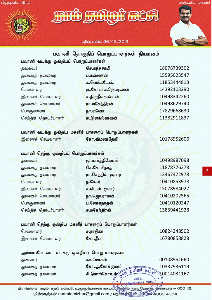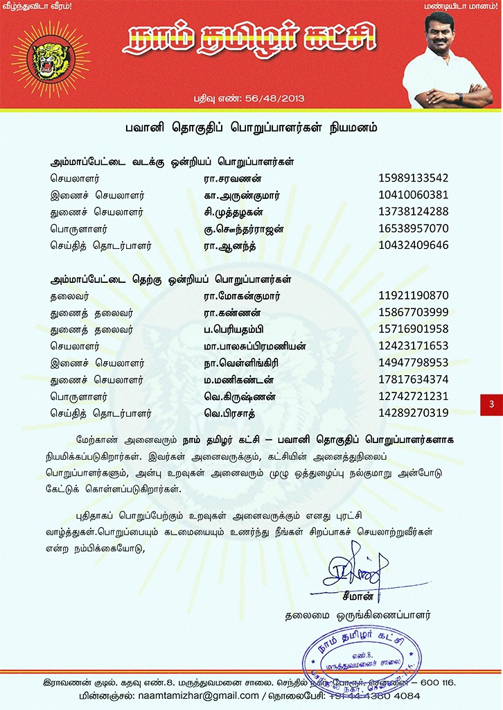 மேற்காண் அனைவரும் நாம் தமிழர் கட்சி – பவானி தொகுதிப் பொறுப்பாளர்களாக நியமிக்கப்படுகிறார்கள். இவர்கள் அனைவருக்கும், கட்சியின் அனைத்துநிலைப் பொறுப்பாளர்களும், அன்பு உறவுகள் அனைவரும் முழு ஒத்துழைப்பு நல்குமாறு அன்போடு கேட்டுக் கொள்ளப்படுகிறார்கள்.