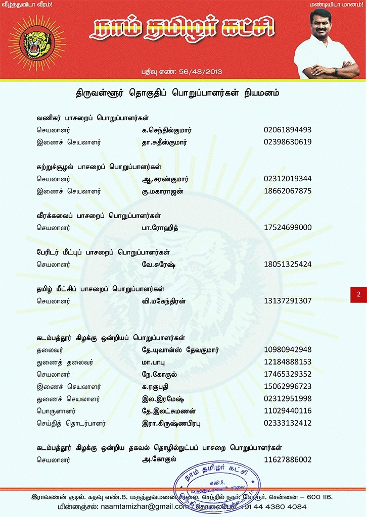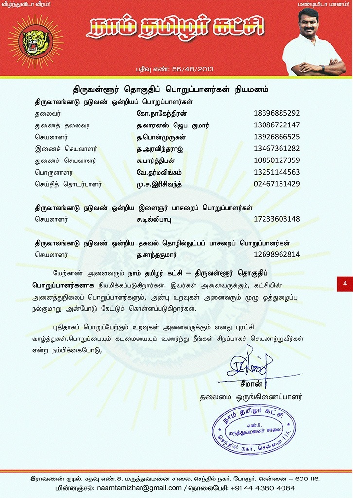 மேற்காண் அனைவரும் நாம் தமிழர் கட்சி – திருவள்ளூர் தொகுதிப் பொறுப்பாளர்களாக நியமிக்கப்படுகிறார்கள். இவர்கள் அனைவருக்கும், கட்சியின் அனைத்துநிலைப் பொறுப்பாளர்களும், அன்பு உறவுகள் அனைவரும் முழு ஒத்துழைப்பு நல்குமாறு அன்போடு கேட்டுக் கொள்ளப்படுகிறார்கள்.