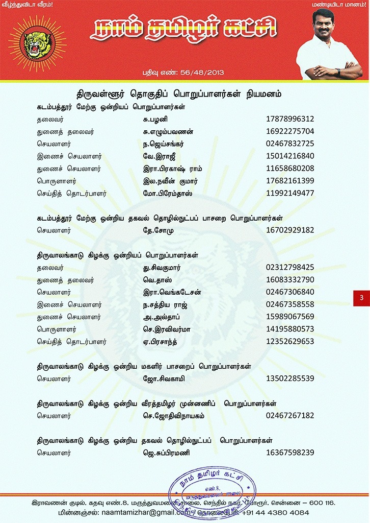 மேற்காண் அனைவரும் நாம் தமிழர் கட்சி – திருவள்ளூர் தொகுதிப் பொறுப்பாளர்களாக நியமிக்கப்படுகிறார்கள். இவர்கள் அனைவருக்கும், கட்சியின் அனைத்துநிலைப் பொறுப்பாளர்களும், அன்பு உறவுகள் அனைவரும் முழு ஒத்துழைப்பு நல்குமாறு அன்போடு கேட்டுக் கொள்ளப்படுகிறார்கள்.