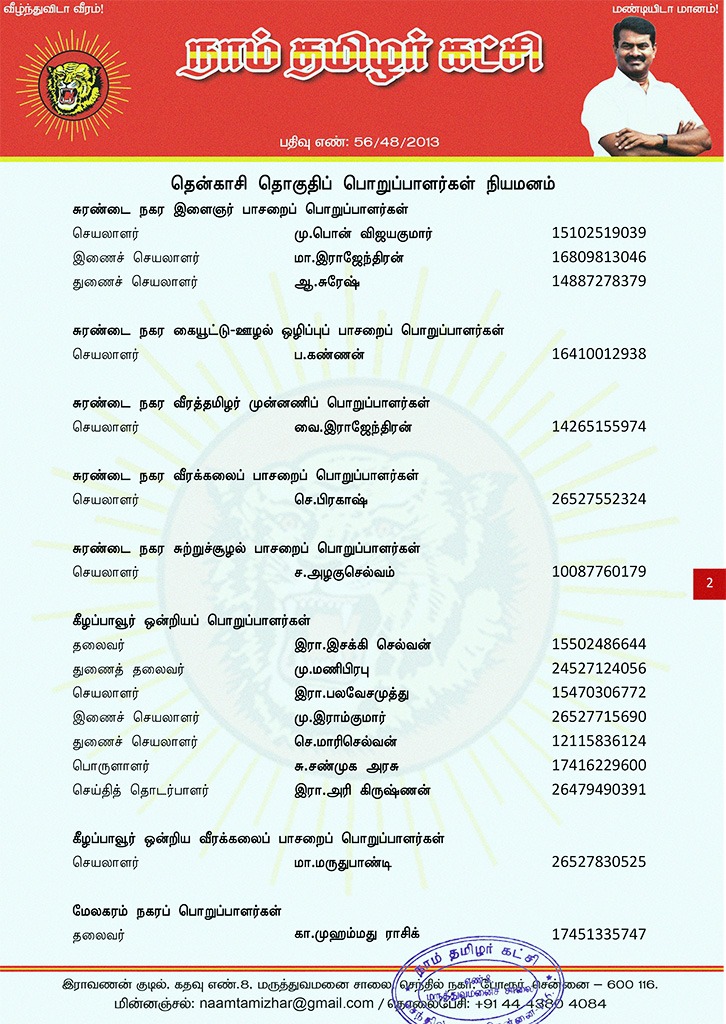 மேற்காண் அனைவரும் நாம் தமிழர் கட்சி – தென்காசி தொகுதிப் பொறுப்பாளர்களாக நியமிக்கப்படுகிறார்கள்.இவர்கள் அனைவருக்கும், கட்சியின் அனைத்துநிலைப் பொறுப்பாளர்களும், அன்பு உறவுகள் அனைவரும் முழு ஒத்துழைப்பு நல்குமாறு அன்போடு கேட்டுக் கொள்ளப்படுகிறார்கள்.