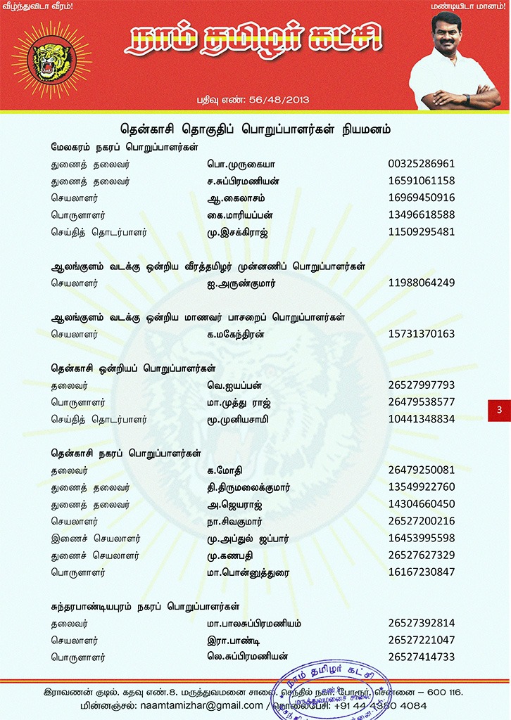 மேற்காண் அனைவரும் நாம் தமிழர் கட்சி – தென்காசி தொகுதிப் பொறுப்பாளர்களாக நியமிக்கப்படுகிறார்கள்.இவர்கள் அனைவருக்கும், கட்சியின் அனைத்துநிலைப் பொறுப்பாளர்களும், அன்பு உறவுகள் அனைவரும் முழு ஒத்துழைப்பு நல்குமாறு அன்போடு கேட்டுக் கொள்ளப்படுகிறார்கள்.