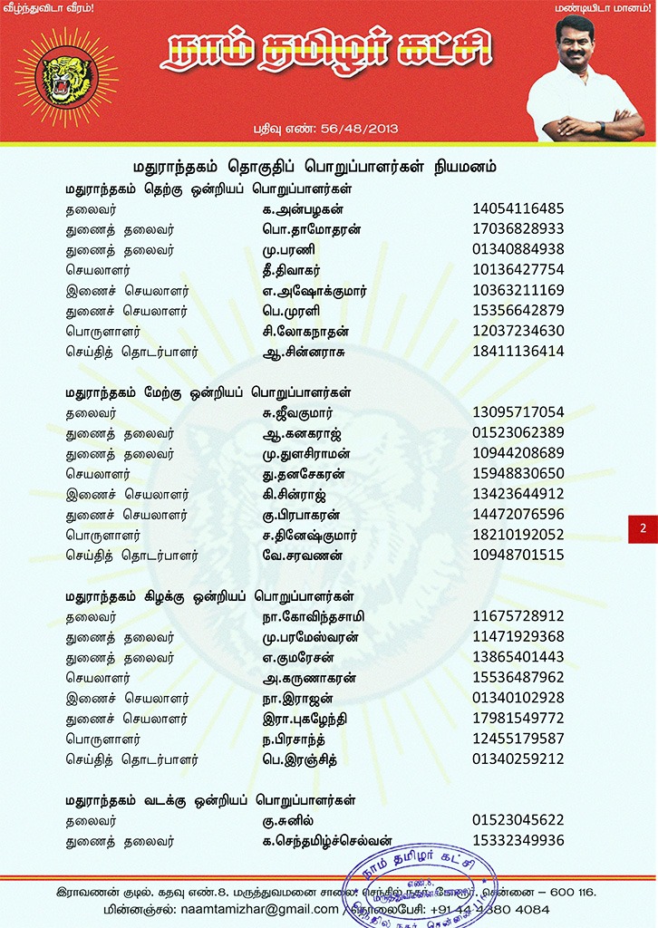 மேற்காண் அனைவரும் நாம் தமிழர் கட்சி – மதுராந்தகம் தொகுதிப் பொறுப்பாளர்களாக நியமிக்கப்படுகிறார்கள். இவர்கள் அனைவருக்கும், கட்சியின் அனைத்துநிலைப் பொறுப்பாளர்களும், அன்பு உறவுகள் அனைவரும் முழு ஒத்துழைப்பு நல்குமாறு அன்போடு கேட்டுக் கொள்ளப்படுகிறார்கள்.
