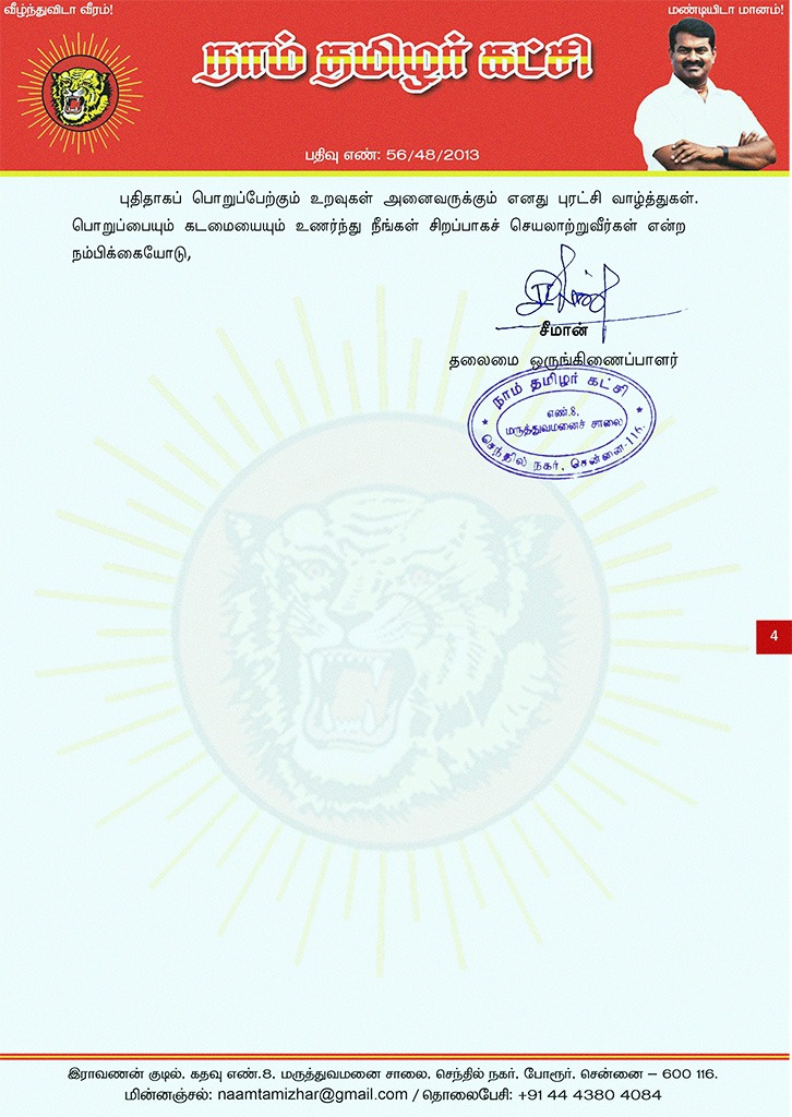 புதிதாகப் பொறுப்பேற்கும் உறவுகள் அனைவருக்கும் எனது புரட்சி வாழ்த்துகள். பொறுப்பையும் கடமையையும் உணர்ந்து நீங்கள் சிறப்பாகச் செயலாற்றுவீர்கள் என்ற நம்பிக்கையோடு,