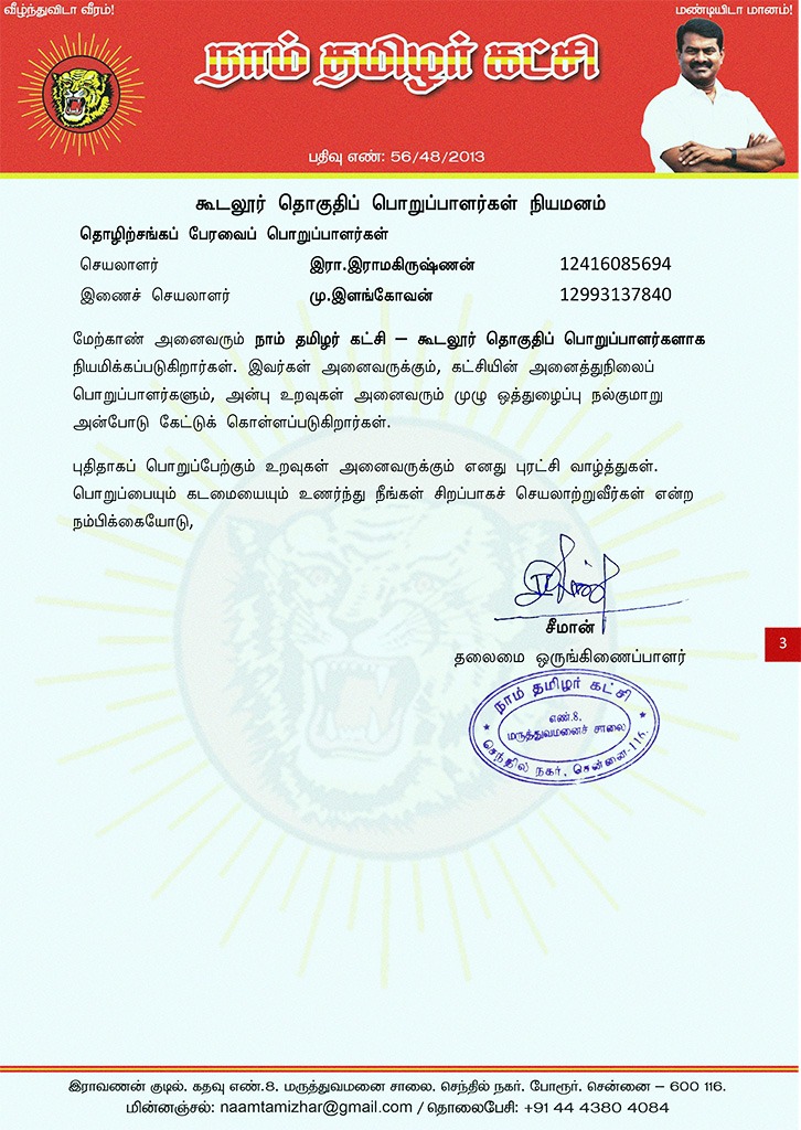 மேற்காண் அனைவரும் நாம் தமிழர் கட்சி – கூடலூர் தொகுதிப் பொறுப்பாளர்களாக நியமிக்கப்படுகிறார்கள். இவர்கள் அனைவருக்கும், கட்சியின் அனைத்துநிலைப் பொறுப்பாளர்களும், அன்பு உறவுகள் அனைவரும் முழு ஒத்துழைப்பு நல்குமாறு அன்போடு கேட்டுக் கொள்ளப்படுகிறார்கள்.