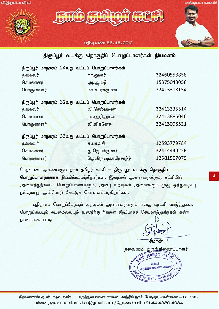 மேற்காண் அனைவரும் நாம் தமிழர் கட்சி – திருப்பூர் வடக்கு தொகுதிப் பொறுப்பாளர்களாக நியமிக்கப்படுகிறார்கள். இவர்கள் அனைவருக்கும், கட்சியின் அனைத்துநிலைப் பொறுப்பாளர்களும், அன்பு உறவுகள் அனைவரும் முழு ஒத்துழைப்பு நல்குமாறு அன்போடு கேட்டுக் கொள்ளப்படுகிறார்கள்.