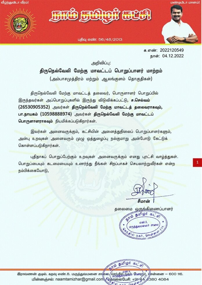 திருநெல்வேலி மேற்கு மாவட்டத் தலைவர், பொருளாளர் பொறுப்பில் இருந்தவர்கள் அப்பொறுப்புகளில் இருந்து விடுவிக்கப்பட்டு, ச.செல்வம் (26530905352) அவர்கள் திருநெல்வேலி மேற்கு மாவட்டத் தலைவராகவும், பா.நாயகம் (10598888974) அவர்கள் திருநெல்வேலி மேற்கு மாவட்டப் பொருளாளராகவும் நியமிக்கப்படுகிறார்கள்.