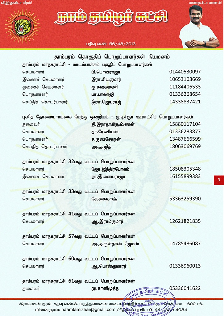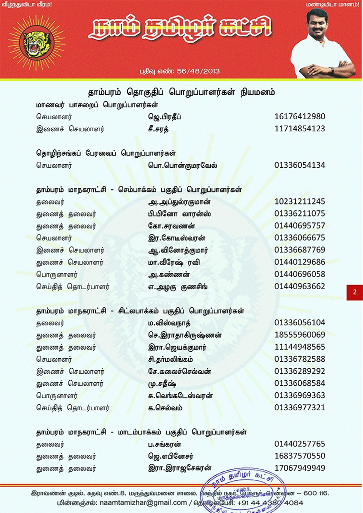 மேற்காண் அனைவரும் நாம் தமிழர் கட்சி – தாம்பரம் தொகுதிப் பொறுப்பாளர்களாக நியமிக்கப்படுகிறார்கள். இவர்கள் அனைவருக்கும், கட்சியின் அனைத்துநிலைப் பொறுப்பாளர்களும், அன்பு உறவுகள் அனைவரும் முழு ஒத்துழைப்பு நல்குமாறு அன்போடு கேட்டுக் கொள்ளப்படுகிறார்கள்.