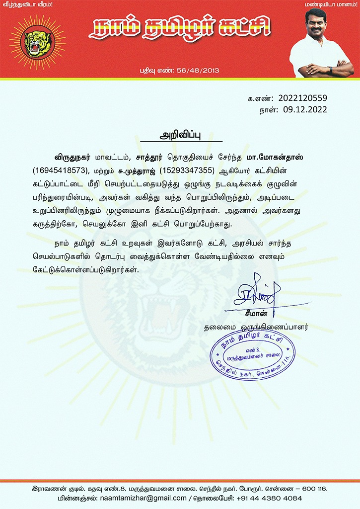 விருதுநகர் மாவட்டம், சாத்தூர் தொகுதியைச் சேர்ந்த மா.மோகன்தாஸ் (16945418573), மற்றும் சு.முத்துராஜ் (15293347355) ஆகியோர் கட்சியின் கட்டுப்பாட்டை மீறி செயற்பட்டதையடுத்து ஒழுங்கு நடவடிக்கைக் குழுவின் பரிந்துரையின்படி, அவர்கள் வகித்து வந்த பொறுப்பிலிருந்தும், அடிப்படை உறுப்பினரிலிருந்தும் முழுமையாக நீக்கப்படுகிறார்கள். அதனால் அவர்களது கருத்திற்கோ, செயலுக்கோ இனி கட்சி பொறுப்பேற்காது.