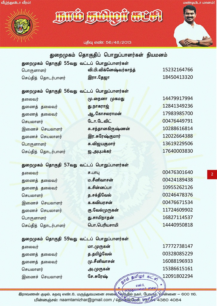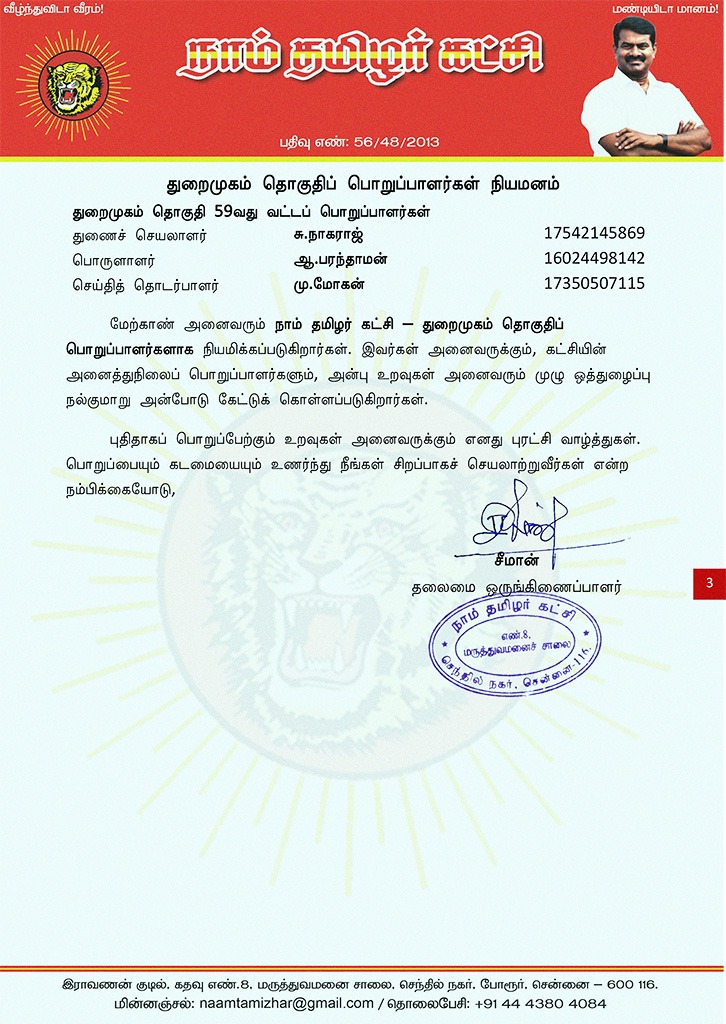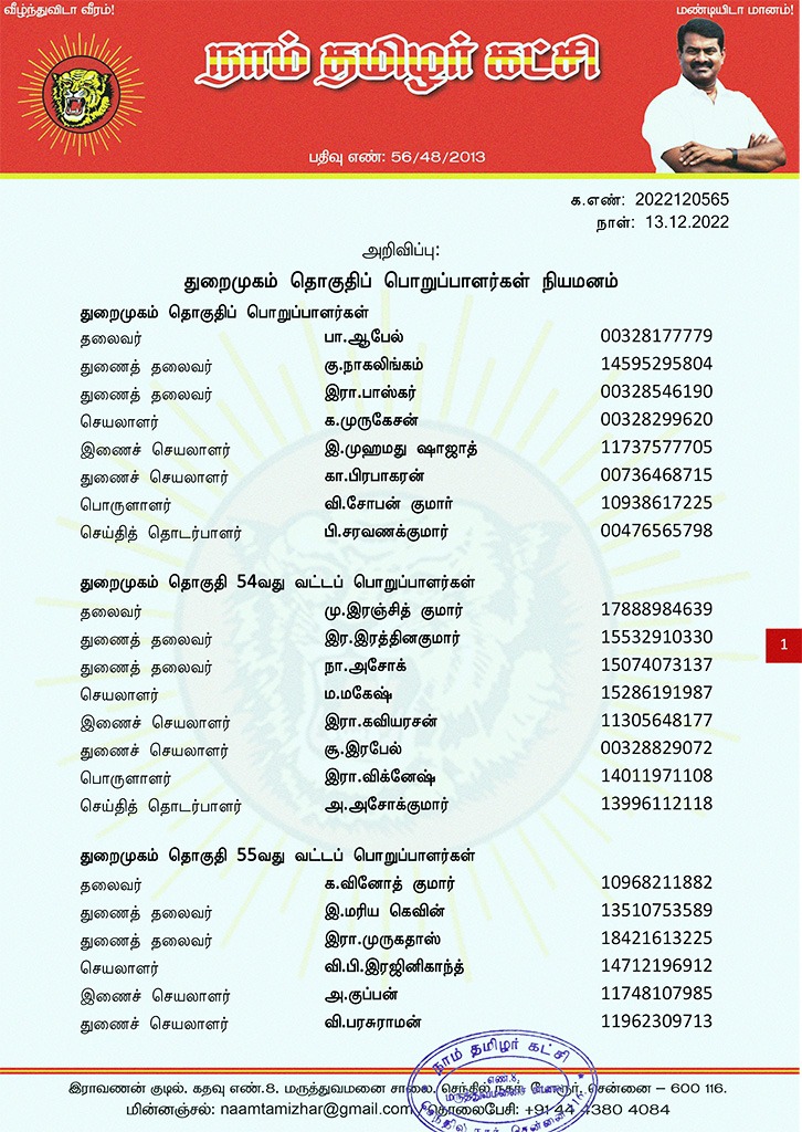 மேற்காண் அனைவரும் நாம் தமிழர் கட்சி – துறைமுகம் தொகுதிப் பொறுப்பாளர்களாக நியமிக்கப்படுகிறார்கள். இவர்கள் அனைவருக்கும், கட்சியின் அனைத்துநிலைப் பொறுப்பாளர்களும், அன்பு உறவுகள் அனைவரும் முழு ஒத்துழைப்பு நல்குமாறு அன்போடு கேட்டுக் கொள்ளப்படுகிறார்கள்.