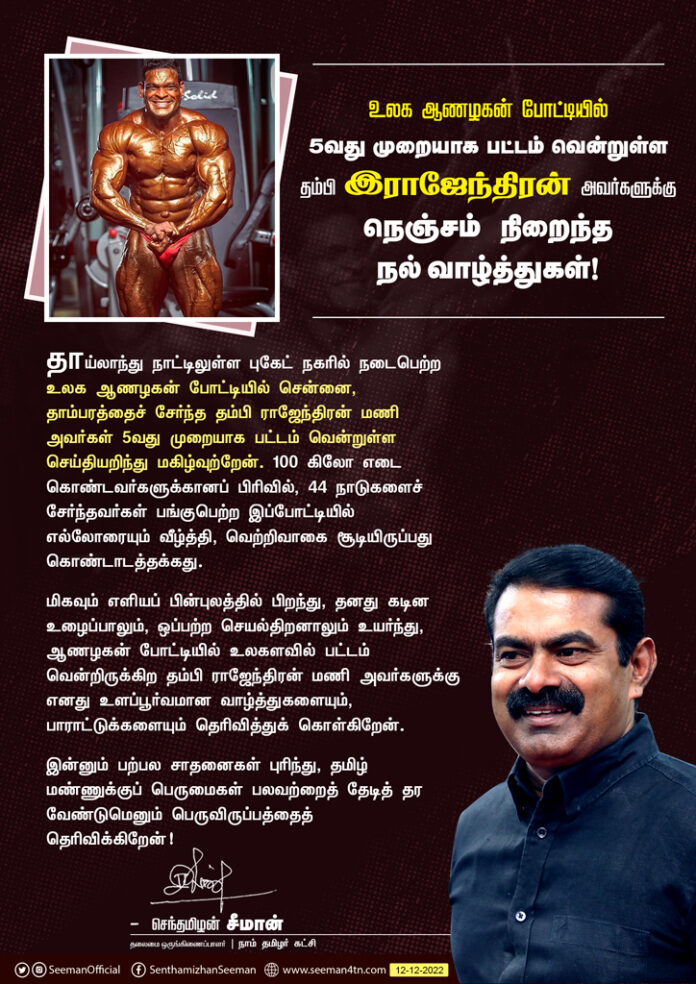 எனது உளப்பூர்வமான வாழ்த்துகளையும், பாராட்டுக்களையும் தெரிவித்துக் கொள்கிறேன்.https://t.co/RcfDNj2jEX pic.twitter.com/2k0TAmSzAf— சீமான் (@SeemanOfficial) December 12, 2022