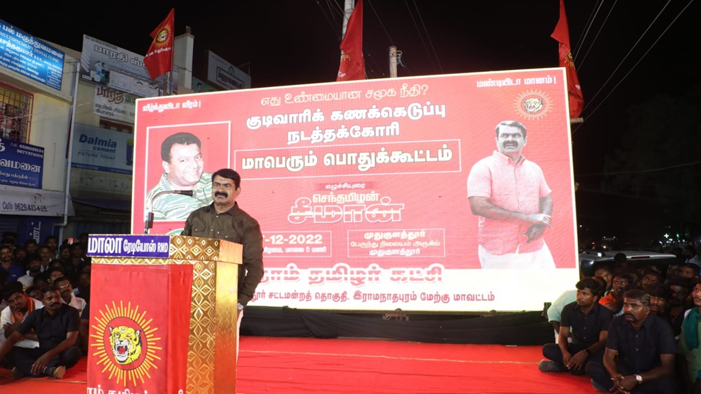 உண்மையான சமூகநீதியை நிலைநாட்டுவதற்கு, குடிவாரி கணக்கெடுப்பை தமிழ்நாடு அரசு உடனடியாக நடத்திடக் கோரி, நாம் தமிழர் கட்சி சார்பாக தலைமை ஒருங்கிணைப்பாளர் சீமான் அவர்களின் தலைமையில் 17-12-2022 அன்று மாலை 05 மணியளவில், இராமநாதபுரம் மாவட்டம், முதுகுளத்தூர் பேருந்து நிலையம் அருகில், மாபெரும் பொதுக்கூட்டம் நடைபெற்றது. இப்பொதுக்கூட்டத்தின் நிறைவாக சீமான் அவர்கள் ஆற்றிய எழுச்சியுரையின் சுருக்கமான எழுத்தாக்கம் பின்வருமாறு,