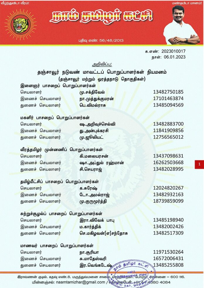 மேற்காண் அனைவரும் நாம் தமிழர் கட்சி – தஞ்சாவூர் நடுவண் மாவட்டப் பொறுப்பாளர்களாக நியமிக்கப்படுகிறார்கள். இவர்கள் அனைவருக்கும், கட்சியின் அனைத்துநிலைப் பொறுப்பாளர்களும், அன்பு உறவுகள் அனைவரும் முழு ஒத்துழைப்பு நல்குமாறு அன்போடு கேட்டுக் கொள்ளப்படுகிறார்கள்.