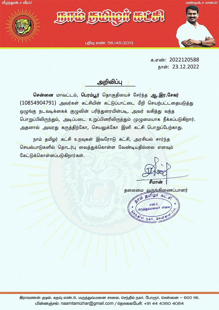 சென்னை மாவட்டம், பெரம்பூர் தொகுதியைச் சேர்ந்த ஆ.இர.சேகர் (10854904791) அவர்கள் கட்சியின் கட்டுப்பாட்டை மீறி செயற்பட்டதையடுத்து ஒழுங்கு நடவடிக்கைக் குழுவின் பரிந்துரையின்படி, அவர் வகித்து வந்த பொறுப்பிலிருந்தும், அடிப்படை உறுப்பினரிலிருந்தும் முழுமையாக நீக்கப்படுகிறார். அதனால் அவரது கருத்திற்கோ, செயலுக்கோ இனி கட்சி பொறுப்பேற்காது.