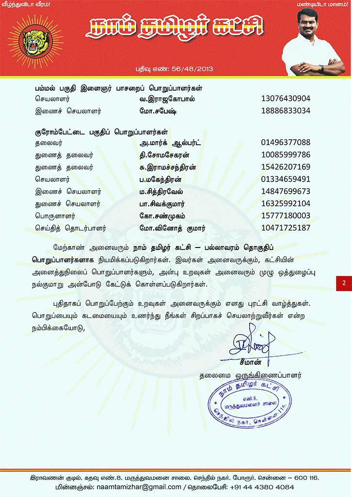 மேற்காண் அனைவரும் நாம் தமிழர் கட்சி – பல்லாவரம் தொகுதிப் பொறுப்பாளர்களாக நியமிக்கப்படுகிறார்கள். இவர்கள் அனைவருக்கும், கட்சியின் அனைத்துநிலைப் பொறுப்பாளர்களும், அன்பு உறவுகள் அனைவரும் முழு ஒத்துழைப்பு நல்குமாறு அன்போடு கேட்டுக் கொள்ளப்படுகிறார்கள்.