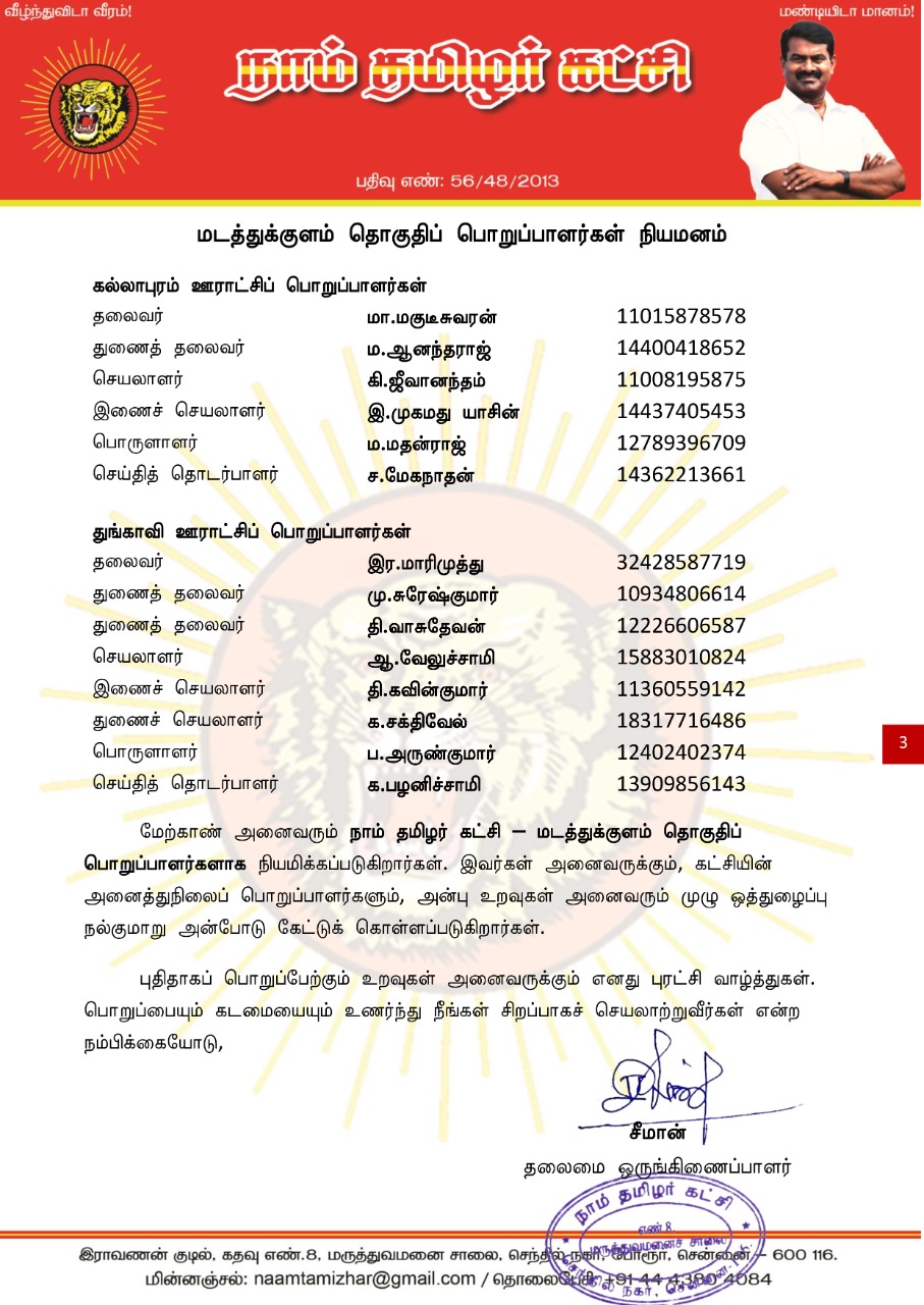 மேற்காண் அனைவரும் நாம் தமிழர் கட்சி – மடத்துக்குளம் தொகுதிப் பொறுப்பாளர்களாக நியமிக்கப்படுகிறார்கள். இவர்கள் அனைவருக்கும், கட்சியின் அனைத்துநிலைப் பொறுப்பாளர்களும், அன்பு உறவுகள் அனைவரும் முழு ஒத்துழைப்பு நல்குமாறு அன்போடு கேட்டுக் கொள்ளப்படுகிறார்கள்.