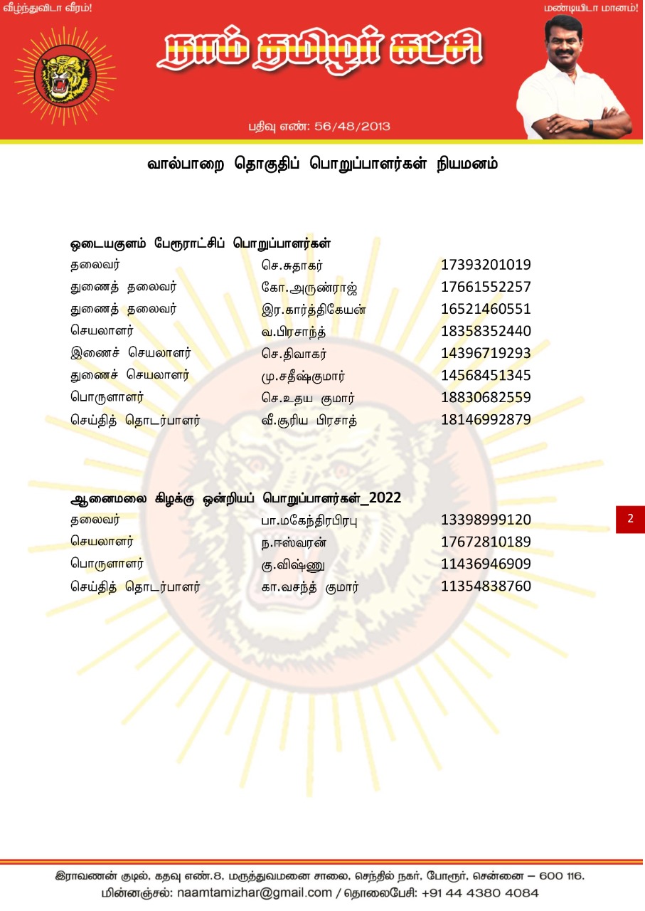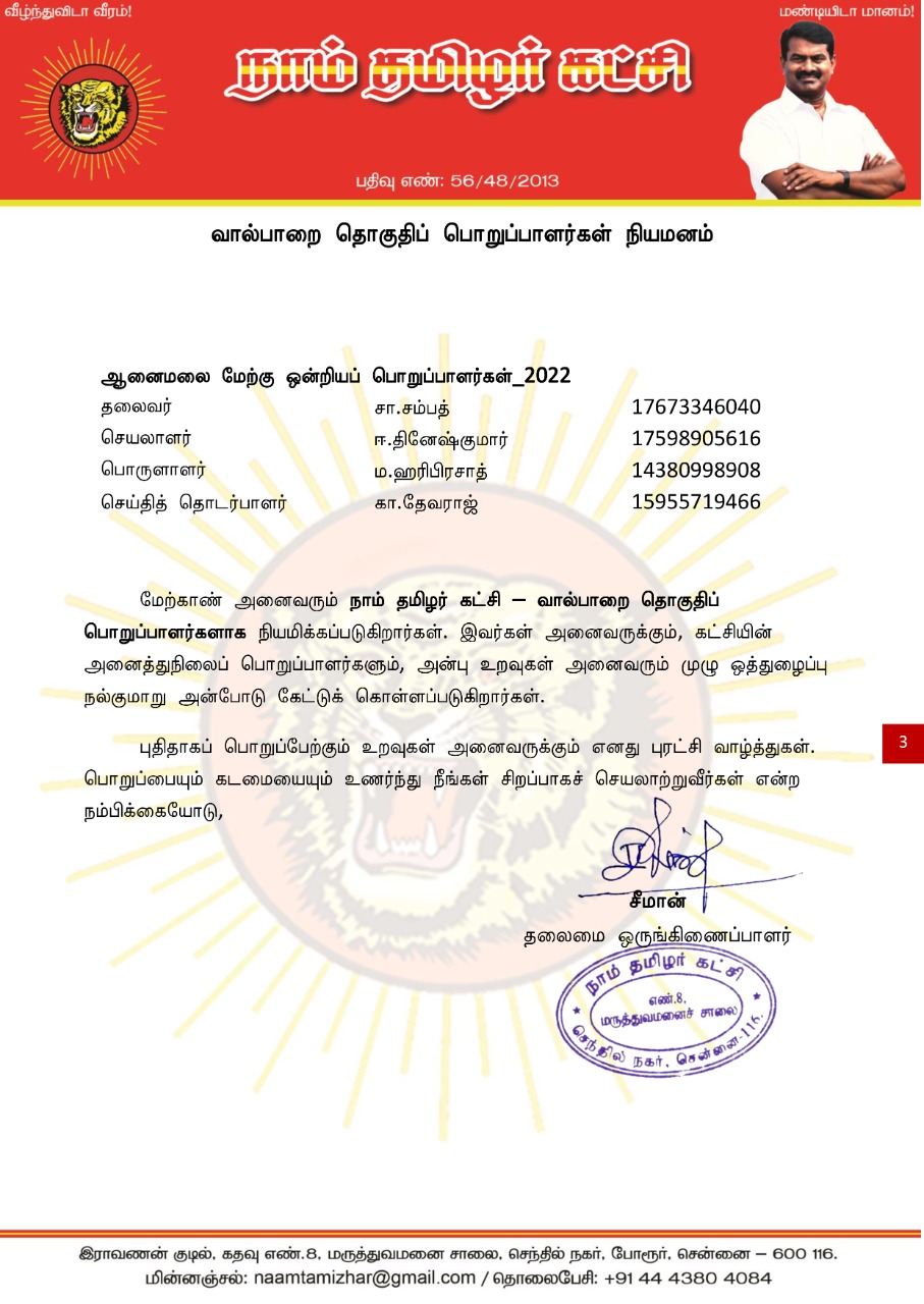 மேற்காண் அனைவரும் நாம் தமிழர் கட்சி – வால்பாறை தொகுதிப் பொறுப்பாளர்களாக நியமிக்கப்படுகிறார்கள். இவர்கள் அனைவருக்கும், கட்சியின் அனைத்துநிலைப் பொறுப்பாளர்களும், அன்பு உறவுகள் அனைவரும் முழு ஒத்துழைப்பு நல்குமாறு அன்போடு கேட்டுக் கொள்ளப்படுகிறார்கள்.