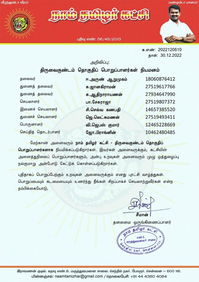 மேற்காண் அனைவரும் நாம் தமிழர் கட்சி திருவைகுண்டம் தொகுதிப் பொறுப்பாளர்களாக நியமிக்கப்படுகிறார்கள். இவர்கள் அனைவருக்கும், கட்சியின் அனைத்துநிலைப் பொறுப்பாளர்களும், அன்பு உறவுகள் அனைவரும் முழு ஒத்துழைப்பு நல்குமாறு அன்போடு கேட்டுக் கொள்ளப்படுகிறார்கள்.