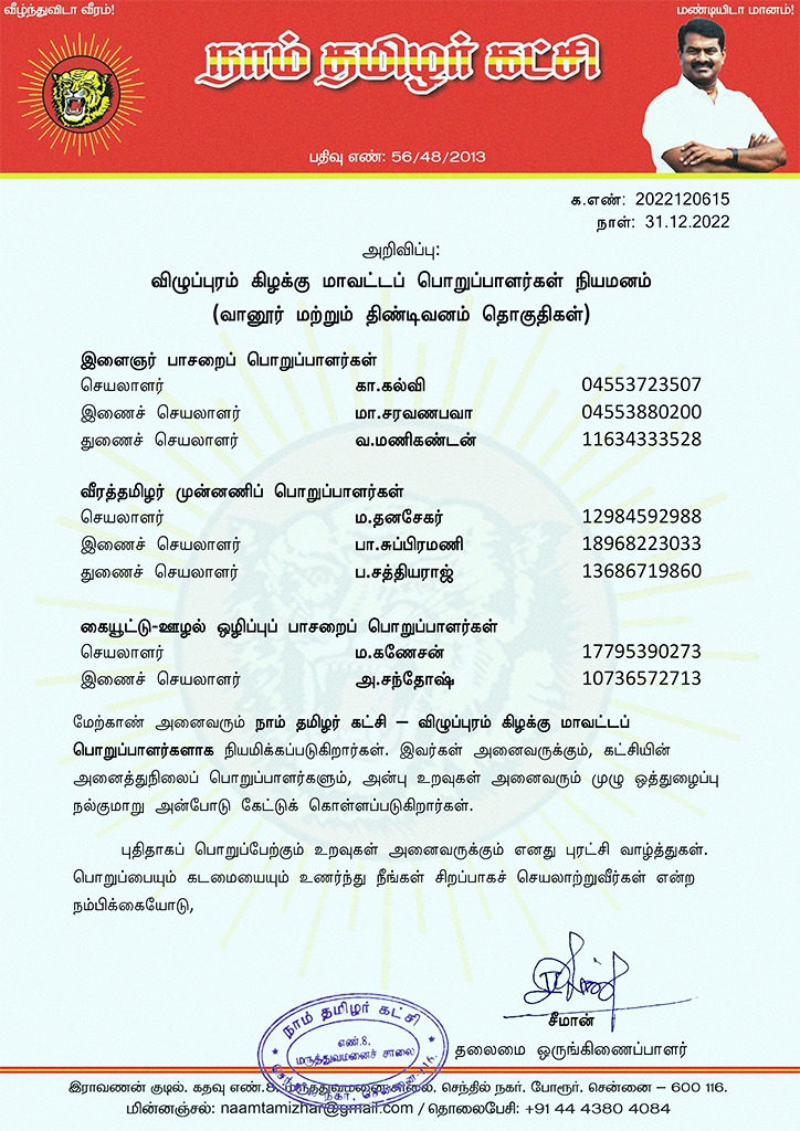 மேற்காண் அனைவரும் நாம் தமிழர் கட்சி – விழுப்புரம் கிழக்கு மாவட்டப் பொறுப்பாளர்களாக நியமிக்கப்படுகிறார்கள். இவர்கள் அனைவருக்கும், கட்சியின் அனைத்துநிலைப் பொறுப்பாளர்களும், அன்பு உறவுகள் அனைவரும் முழு ஒத்துழைப்பு நல்குமாறு அன்போடு கேட்டுக் கொள்ளப்படுகிறார்கள்.