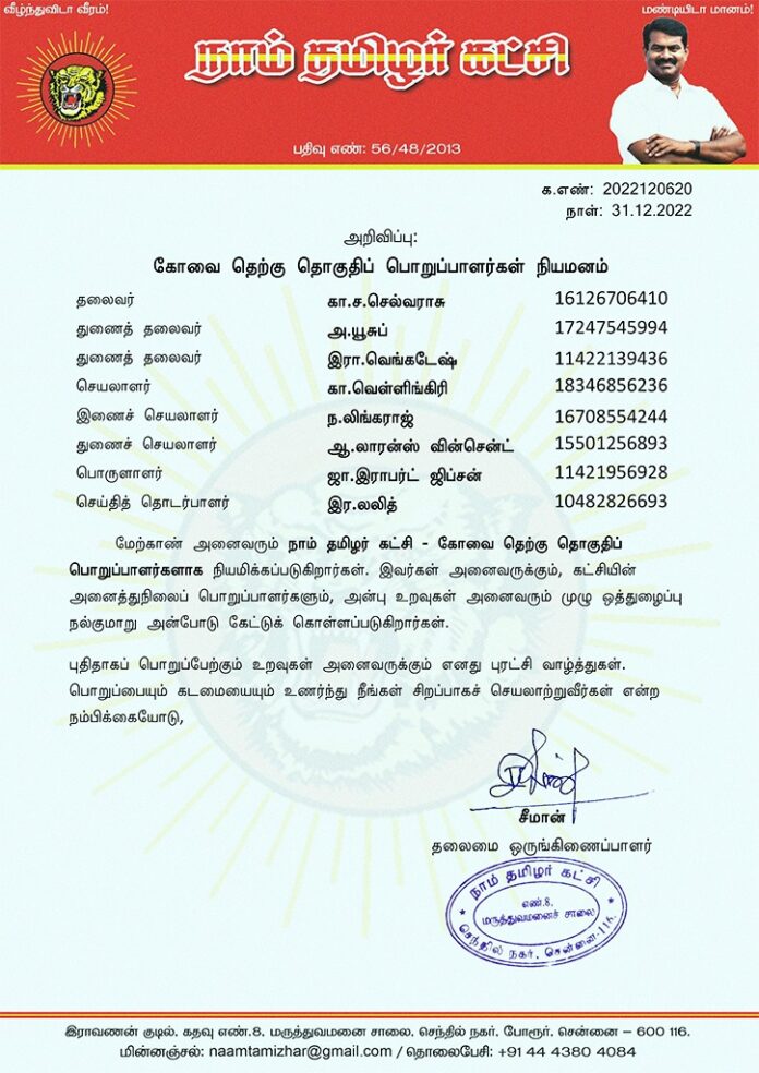 மேற்காண் அனைவரும் நாம் தமிழர் கட்சி – கோவை தெற்கு தொகுதிப் பொறுப்பாளர்களாக நியமிக்கப்படுகிறார்கள். இவர்கள் அனைவருக்கும், கட்சியின் அனைத்துநிலைப் பொறுப்பாளர்களும், அன்பு உறவுகள் அனைவரும் முழு ஒத்துழைப்பு நல்குமாறு அன்போடு கேட்டுக் கொள்ளப்படுகிறார்கள்.