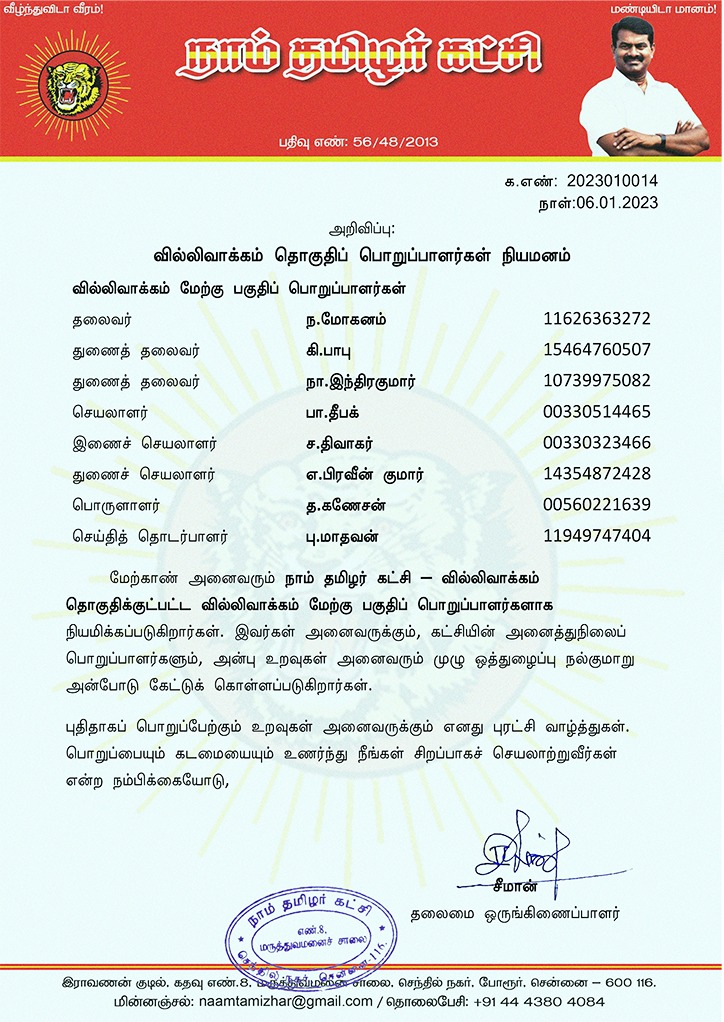 மேற்காண் அனைவரும் நாம் தமிழர் கட்சி – வில்லிவாக்கம் தொகுதிக்குட்பட்ட வில்லிவாக்கம் மேற்கு பகுதிப் பொறுப்பாளர்களாக நியமிக்கப்படுகிறார்கள். இவர்கள் அனைவருக்கும், கட்சியின் அனைத்துநிலைப் பொறுப்பாளர்களும், அன்பு உறவுகள் அனைவரும் முழு ஒத்துழைப்பு நல்குமாறு அன்போடு கேட்டுக் கொள்ளப்படுகிறார்கள்.