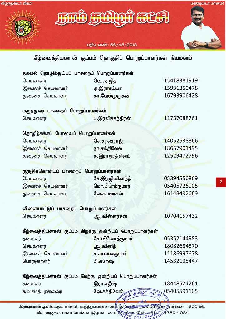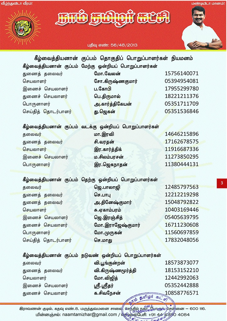 மேற்காண் அனைவரும் நாம் தமிழர் கட்சி – கீழ்வைத்தியனான் குப்பம் தொகுதிப் பொறுப்பாளர்களாக நியமிக்கப்படுகிறார்கள். இவர்கள் அனைவருக்கும், கட்சியின் அனைத்துநிலைப் பொறுப்பாளர்களும், அன்பு உறவுகள் அனைவரும் முழு ஒத்துழைப்பு நல்குமாறு அன்போடு கேட்டுக் கொள்ளப்படுகிறார்கள்.