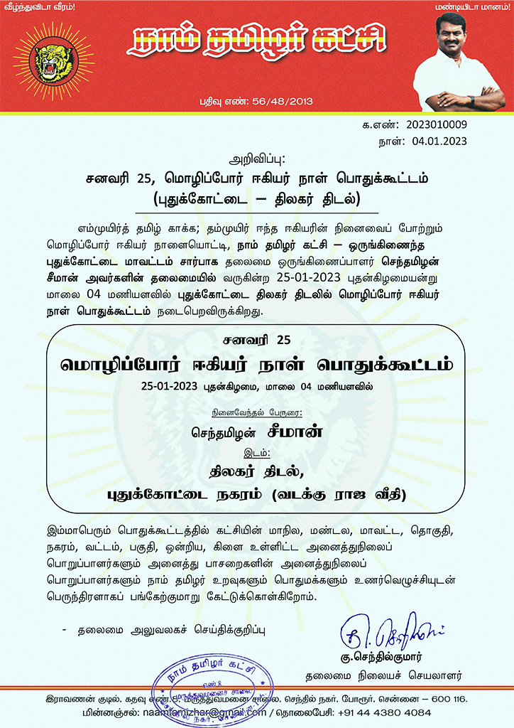 எம்முயிர்த் தமிழ் காக்க; தம்முயிர் ஈந்த ஈகியரின் நினைவைப் போற்றும் மொழிப்போர் ஈகியர் நாளையொட்டி, நாம் தமிழர் கட்சி – ஒருங்கிணைந்த புதுக்கோட்டை மாவட்டம் சார்பாக தலைமை ஒருங்கிணைப்பாளர் செந்தமிழன் சீமான் அவர்களின் தலைமையில் வருகின்ற 25-01-2023 புதன்கிழமையன்று மாலை 04 மணியளவில் புதுக்கோட்டை திலகர் திடலில் மொழிப்போர் ஈகியர் நாள் பொதுக்கூட்டம் நடைபெறவிருக்கிறது.