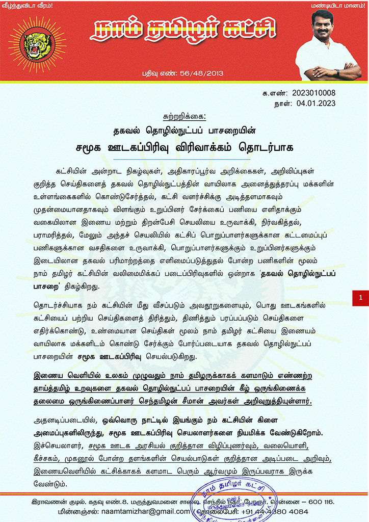 அதனடிப்படையில், ஒவ்வொரு நாட்டில் இயங்கும் நம் கட்சியின் கிளை அமைப்புகளிலிருந்து, சமூக ஊடகப்பிரிவு செயலாளர்களை நியமிக்க வேண்டுகிறோம். இச்செயலாளர், சமூக ஊடக அரசியல் குறித்தான விழிப்புணர்வும், வலையொளி, கீச்சகம், முகனூல் போன்ற தளங்களின் செயல்பாடுகள் குறித்தான அடிப்படை அறிவும், இணையவெளியில் கட்சிக்காகக் களமாட பெரும் ஆர்வமும் இருப்பவராக இருக்க வேண்டும்.