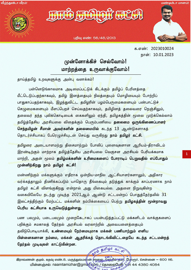 இதனைக் கருத்திற்கொண்டு, “முன்னோக்கிச் செல்வோம்! மாற்றத்தை உருவாக்குவோம்!” என்ற எழுச்சி முழக்கத்தை முன்வைத்து, தகவல் தொழில்நுட்பப் பாசறை சார்பாக, வரும் தமிழர் திருநாளான தைப்பொங்கல் வாரத்தில், தமிழ்நாட்டின் அனைத்து தொகுதியிலும் கட்சிப் பொறுப்பாளர்கள் அனைவரும் ஒருங்கிணைந்து சனவரி 13ஆம் தேதி முதல் 17 ஆம் தேதி வரை தொடர்ச்சியாக மாநிலம் தழுவிய உறுப்பினர் சேர்க்கை முகாம்களை முன்னெடுக்குமாறு, தலைமை ஒருங்கிணைப்பாளர் செந்தமிழன் சீமான் அவர்கள் அறிவுறுத்தியுள்ளார்.