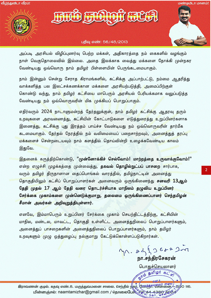 எதிர்வரும் 2024 நாடாளுமன்றத் தேர்தலுக்குள், நாம் தமிழர் கட்சிக்கு ஆதரவு தரும் உறவுகளை அரவணைத்து, கட்சியின் கோட்பாடுகளை எடுத்துரைத்து உறுப்பினர்களாக இணைத்து, கட்சிக்கு புது இரத்தம் பாய்ச்ச வேண்டியது நம் ஒவ்வொருவரின் தார்மீக கடமையாகும். தேர்தல் நேரத்தில் நம் வலிமையைப் பறைசாற்றவும், அனைத்துத் தரப்பு மக்களைச் சென்றடையவும் நாம் களத்தில் தொய்வின்றி உழைக்கவேண்டிய காலம் இதுவே.