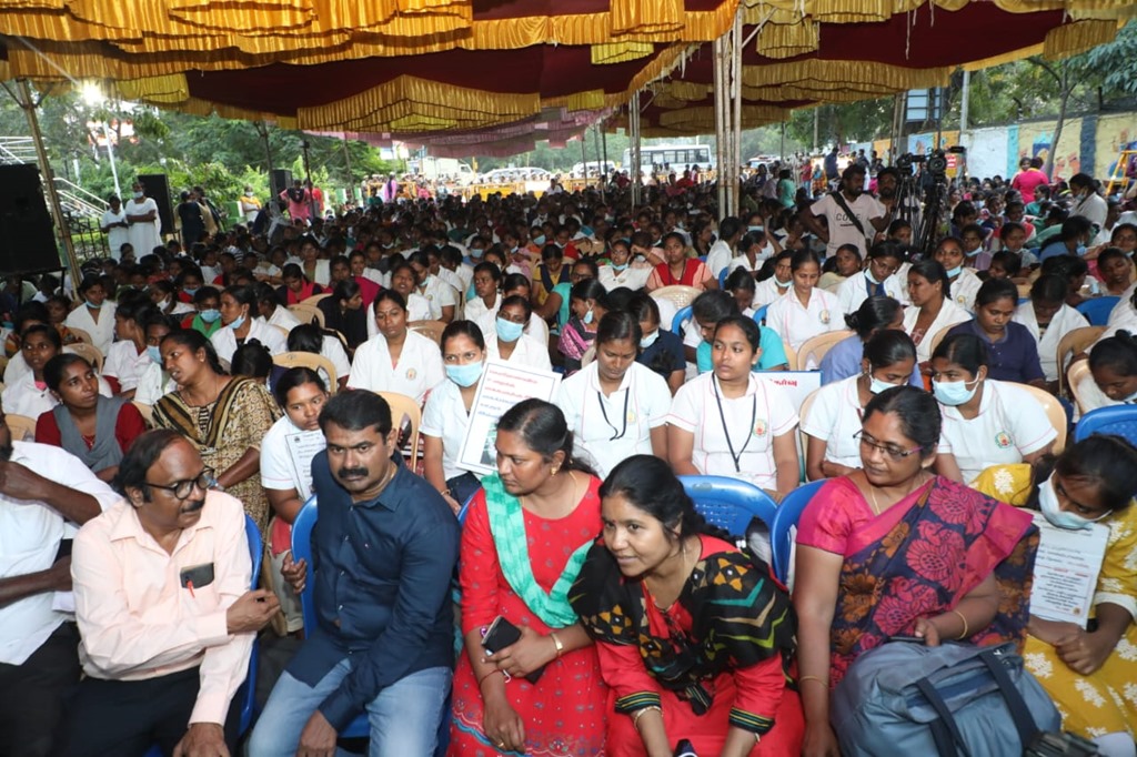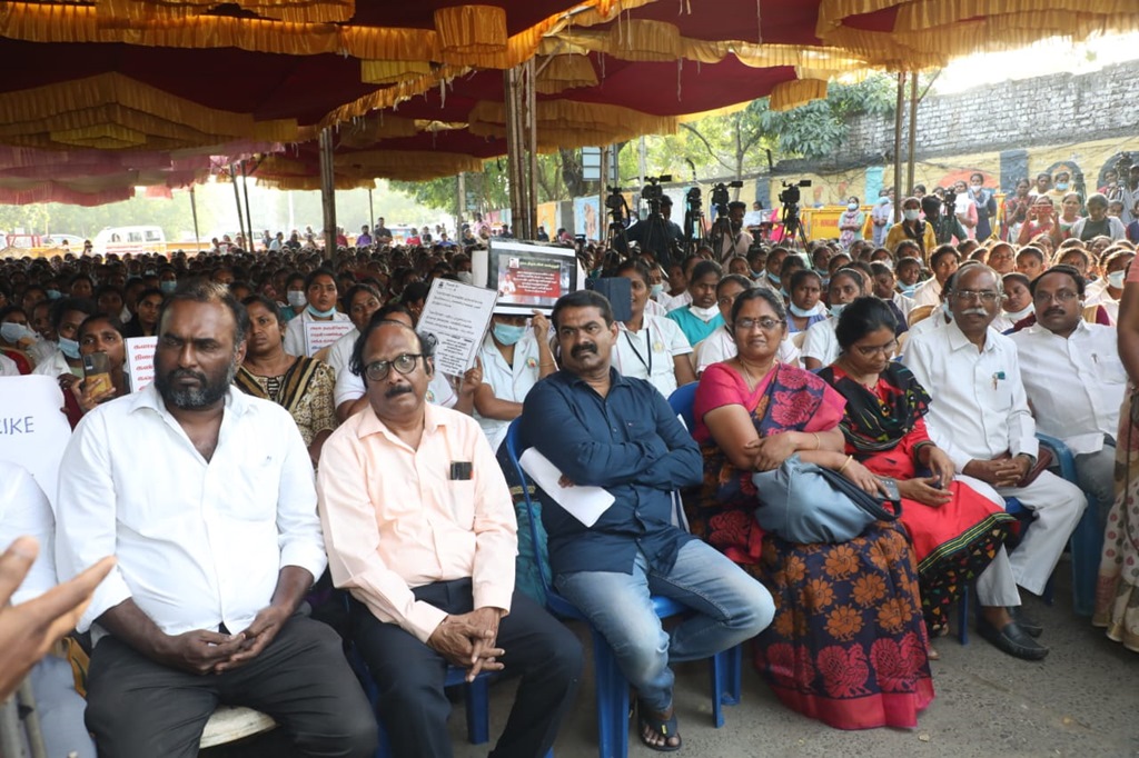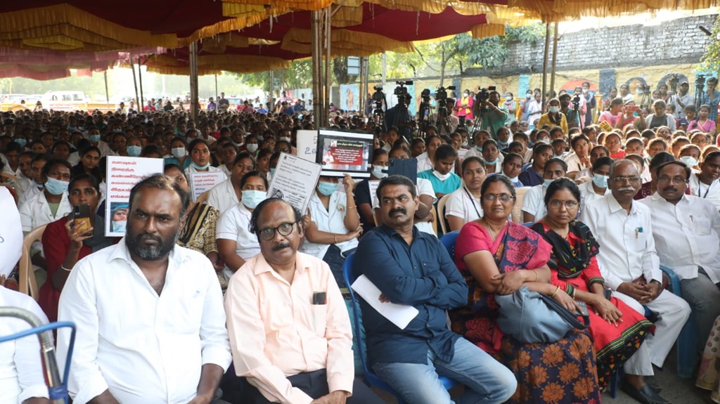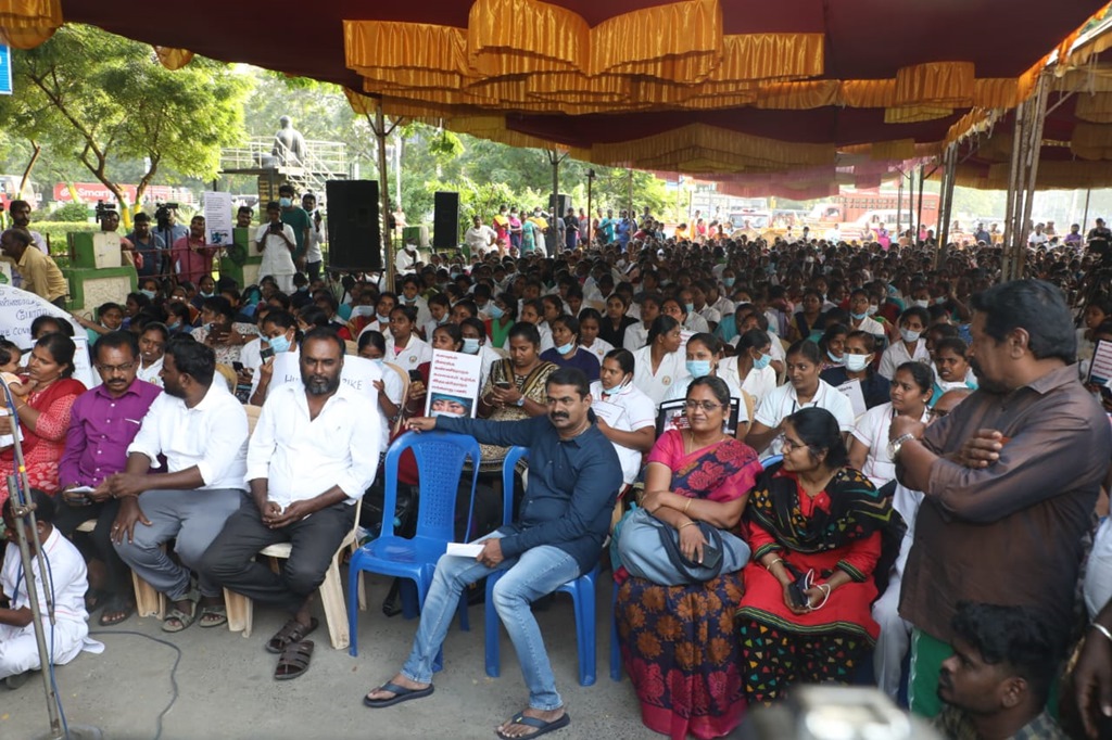 நாம் தமிழர் கட்சியின் தலைமை ஒருங்கிணைப்பாளர் செந்தமிழன் சீமான் அவர்கள் 05-01-2023 அன்று மாலை 04 மணியளவில் செவிலியர்களின் போராட்டத்தில் பங்கேற்று, முழு ஆதரவு தெரிவித்து, கோரிக்கைகளை வலியுறுத்தி உரையாற்றினார்.