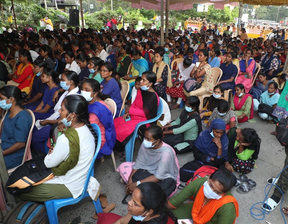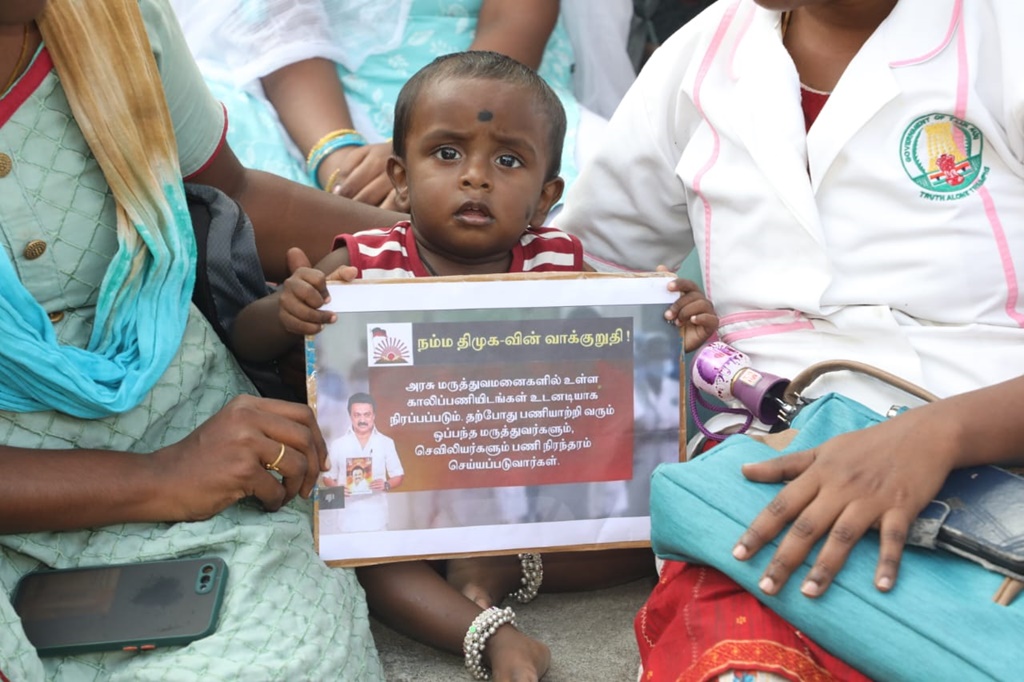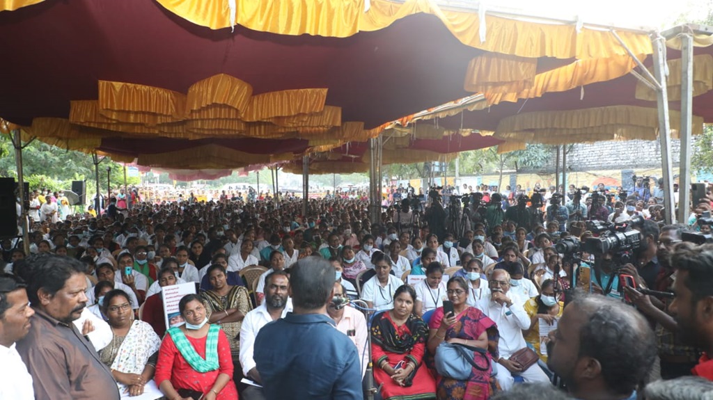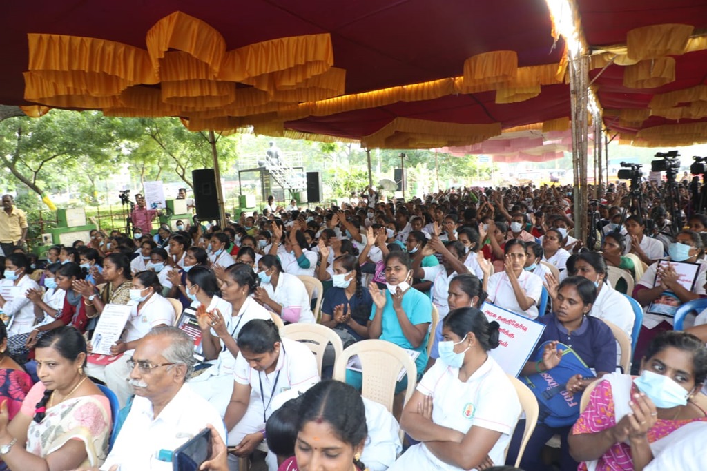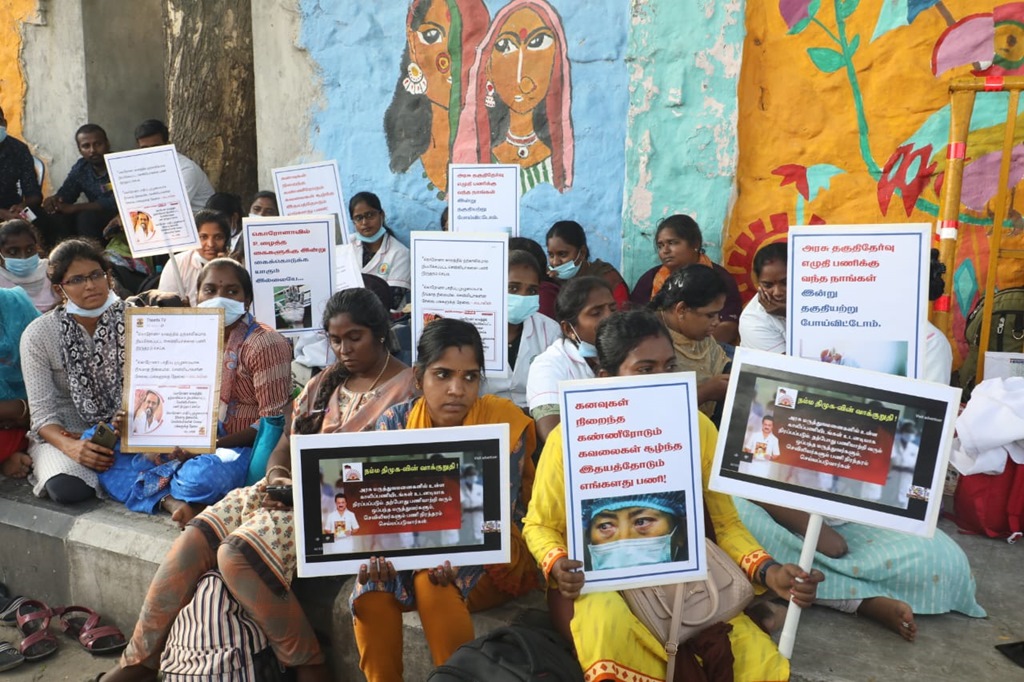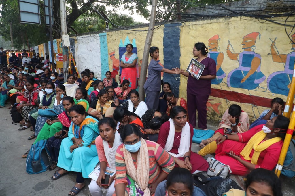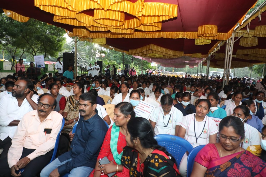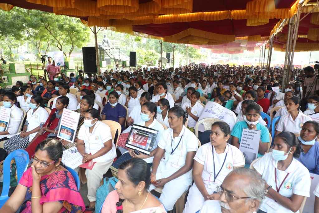 மருத்துவப் பணியாளர் தேர்வு (MRB) மதிப்பெண் மற்றும் இடஒதுக்கீடு அடிப்படையில், கடந்த 2020ஆம் ஆண்டு கொரோனா பெருந்தொற்று பேரிடர் காலத்தில் பணியமர்த்தப்பட்ட 2472 செவிலியர்களை பணிநீக்கம் செய்யும் அரசாணையைத் திரும்பப் பெறக்கோரி, சென்னை வள்ளுவர் கோட்டத்தில் 05-01-2023 காலை 09 மணிமுதல் மாலை 6 மணிவரை உண்ணாநிலைப் போராட்டத்தில் ஈடுபட்டனர்.