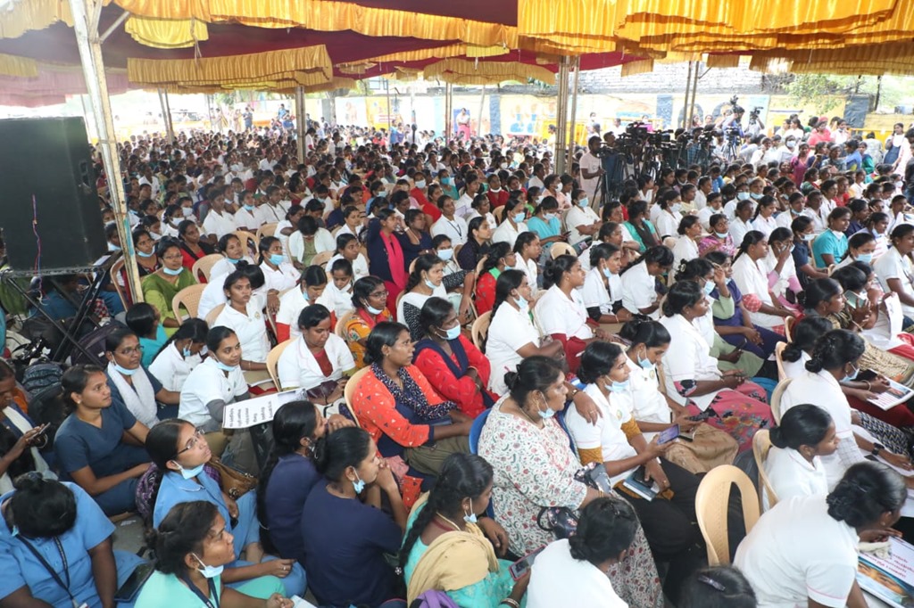 மருத்துவப் பணியாளர் தேர்வு (MRB) மதிப்பெண் மற்றும் இடஒதுக்கீடு அடிப்படையில், கடந்த 2020ஆம் ஆண்டு கொரோனா பெருந்தொற்று பேரிடர் காலத்தில் பணியமர்த்தப்பட்ட 2472 செவிலியர்களை பணிநீக்கம் செய்யும் அரசாணையைத் திரும்பப் பெறக்கோரி, சென்னை வள்ளுவர் கோட்டத்தில் 05-01-2023 காலை 09 மணிமுதல் மாலை 6 மணிவரை உண்ணாநிலைப் போராட்டத்தில் ஈடுபட்டனர்.