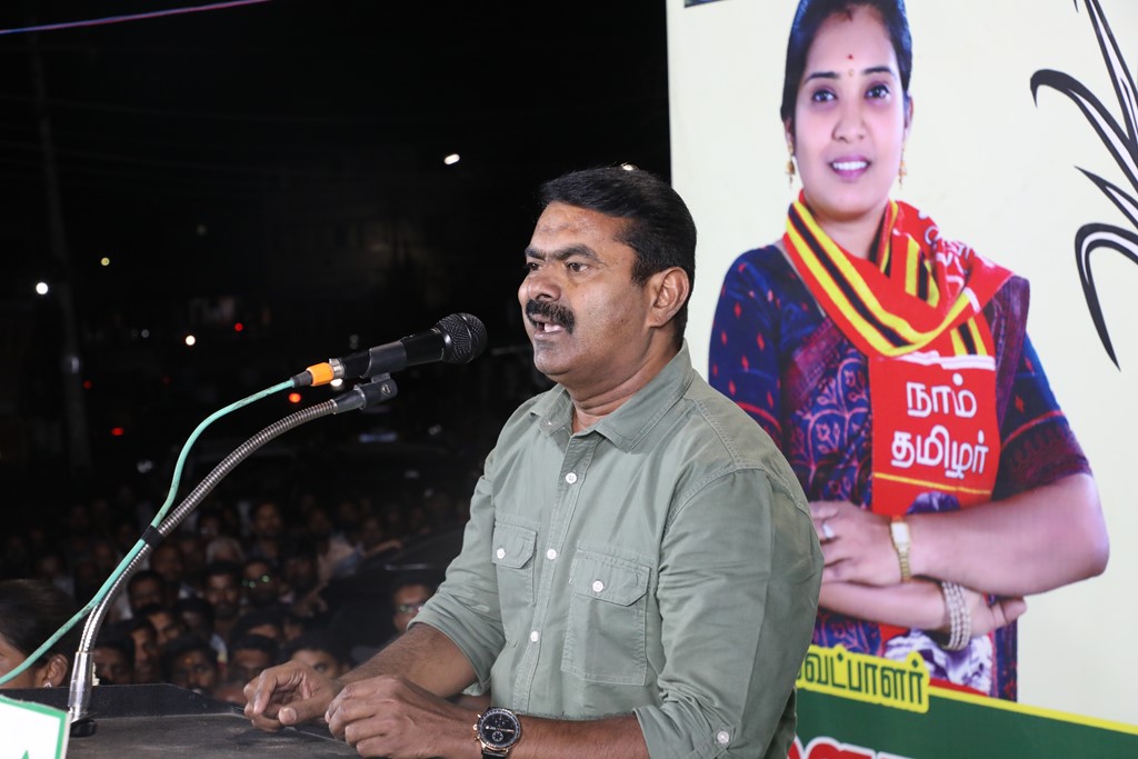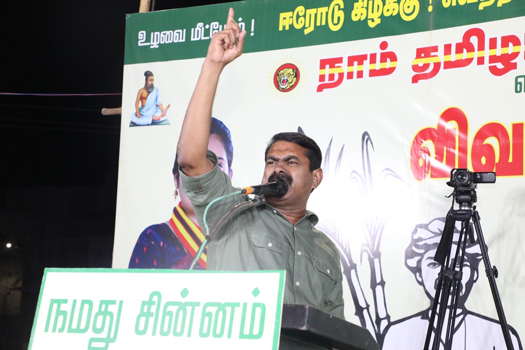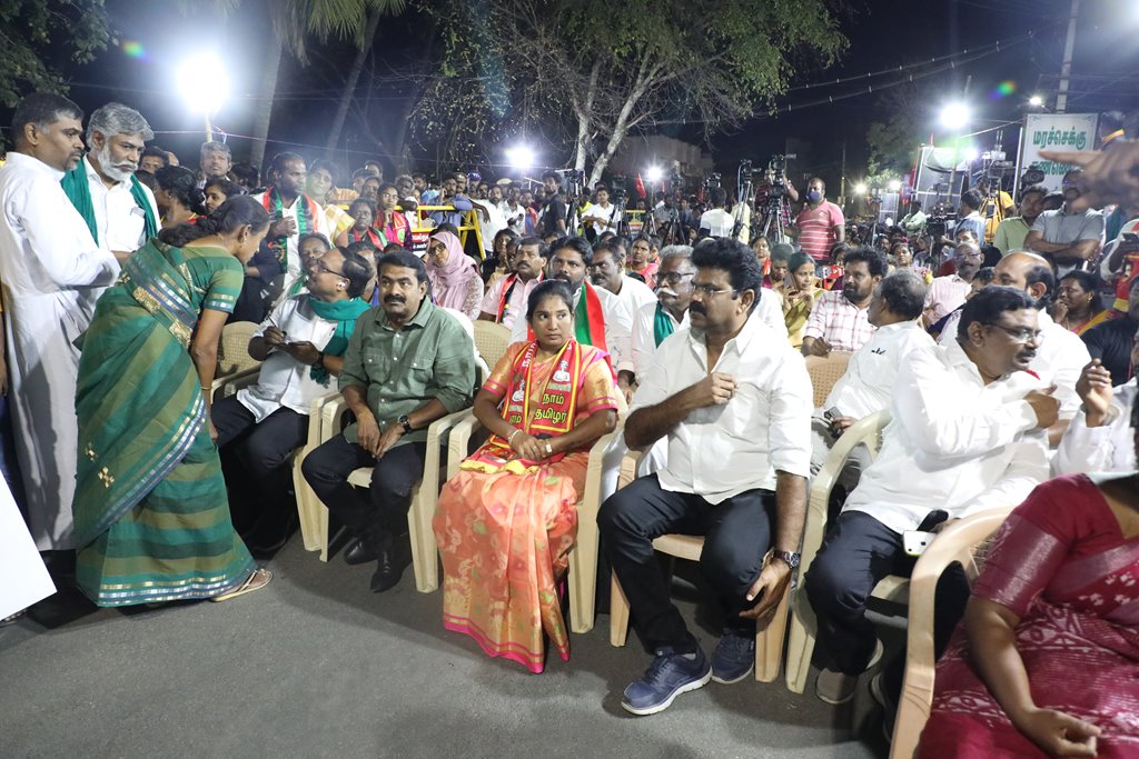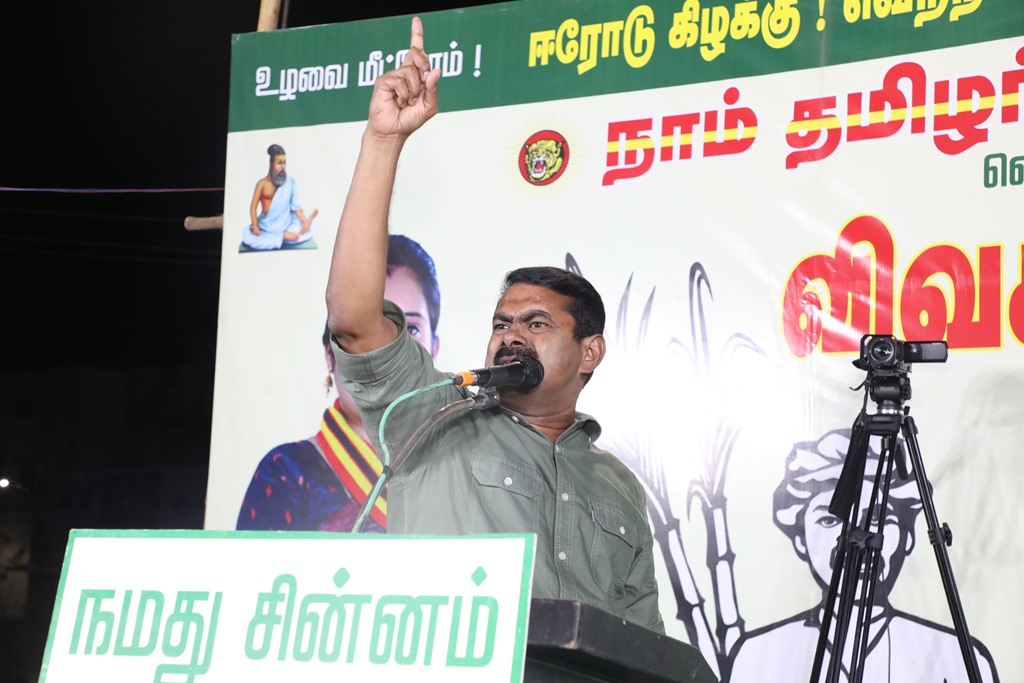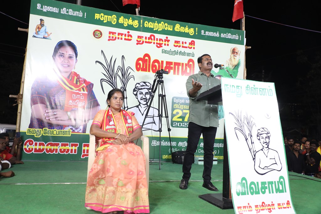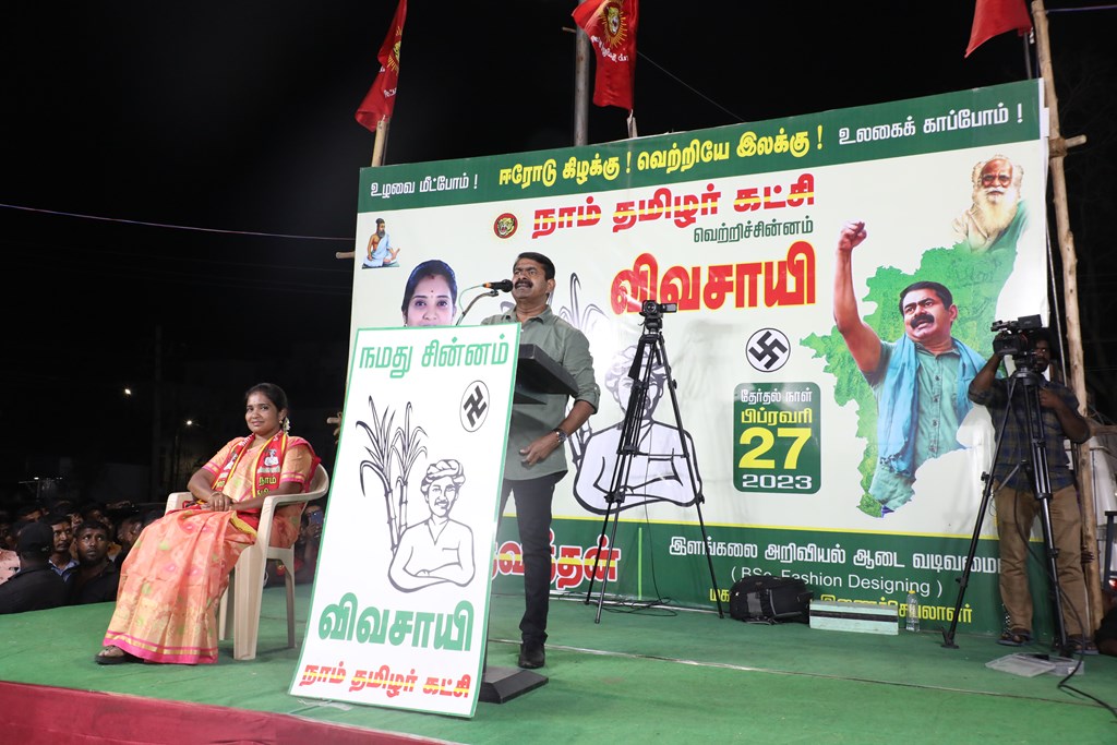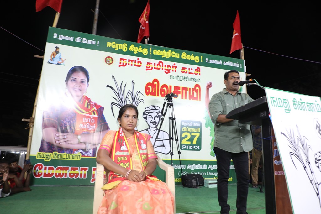 எதிர்வரும் பிப்ரவரி 27 அன்று நடைபெறவிருக்கும், ஈரோடு கிழக்கு சட்டமன்றத் தொகுதிக்கான இடைத்தேர்தலில், மக்களின் துணையோடு மாற்று அரசியல் புரட்சியை ஏற்படுத்த தனித்து களம் காணும் நாம் தமிழர் கட்சி சார்பாக போட்டியிடுகின்ற வேட்பாளர் மேனகா நவநீதன் அவர்களை ஆதரித்து, தலைமை ஒருங்கிணைப்பாளர் செந்தமிழன் சீமான் அவர்களின் தலைமையில் 23-02-2023 அன்று மாலை 04 மணியளவில் ஈரோடு கொல்லம்பாளையம் பகுதியில் மாபெரும் பரப்புரைப் பொதுக்கூட்டம் நடைபெற்றது.