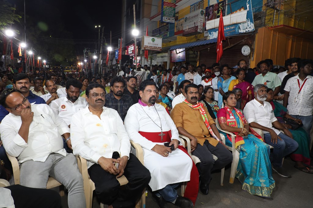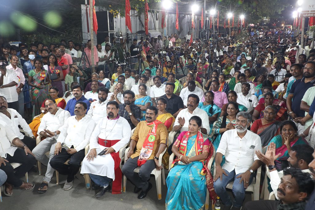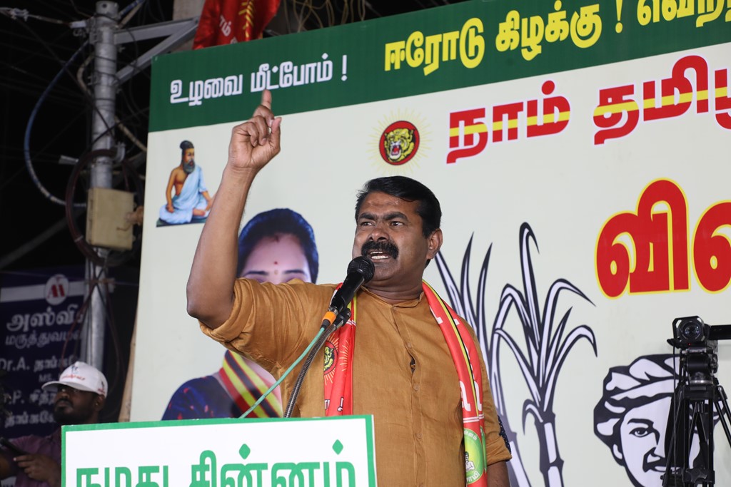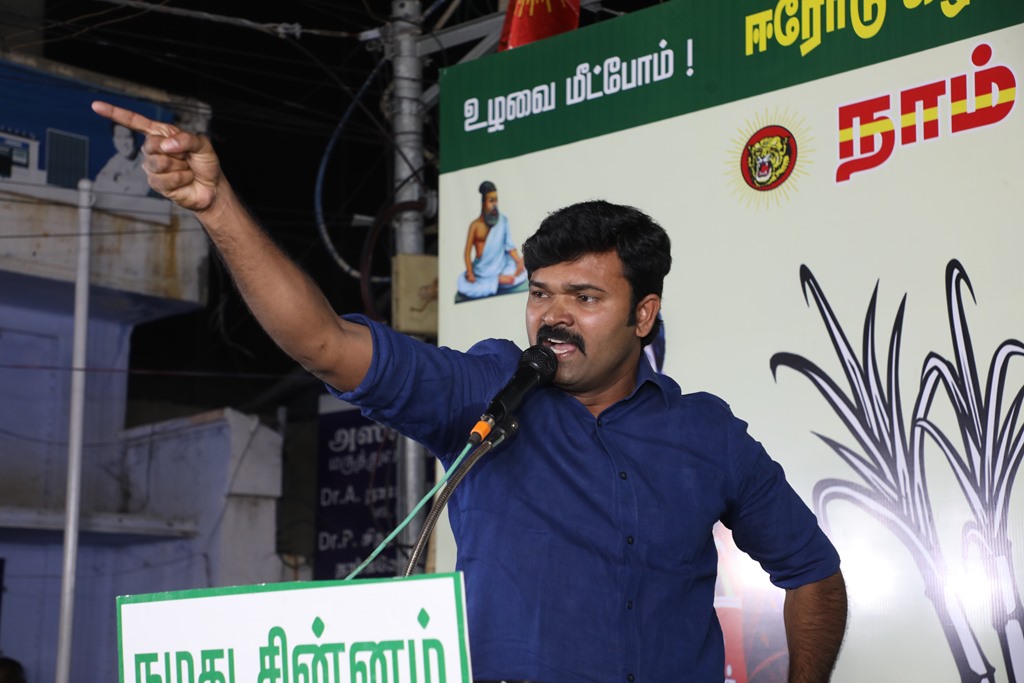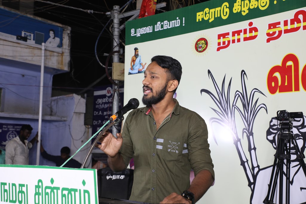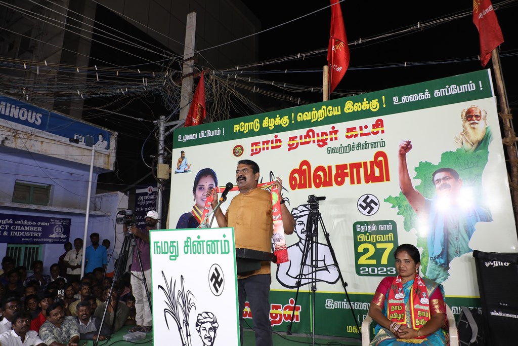 எதிர்வரும் பிப்ரவரி 27 அன்று நடைபெறவிருக்கும், ஈரோடு கிழக்கு சட்டமன்றத் தொகுதிக்கான இடைத்தேர்தலில், மக்களின் துணையோடு மாற்று அரசியல் புரட்சியை ஏற்படுத்த தனித்து களம் காணும் நாம் தமிழர் கட்சி சார்பாக போட்டியிடுகின்ற வேட்பாளர் மேனகா நவநீதன் அவர்களை ஆதரித்து, தலைமை ஒருங்கிணைப்பாளர் செந்தமிழன் சீமான் அவர்களின் தலைமையில் 15-02-2023 அன்று மாலை 04 மணியளவில் ஈரோடு சூரம்பட்டி 4 சாலை பகுதியில் மாபெரும் பரப்புரைப் பொதுக்கூட்டம் நடைபெற்றது.