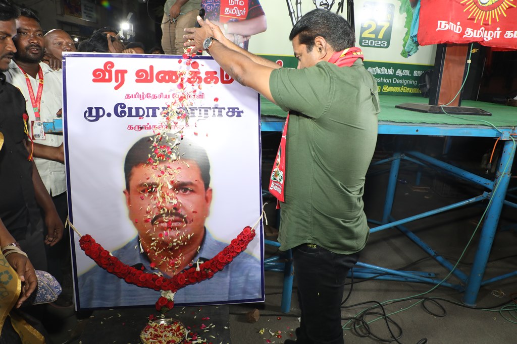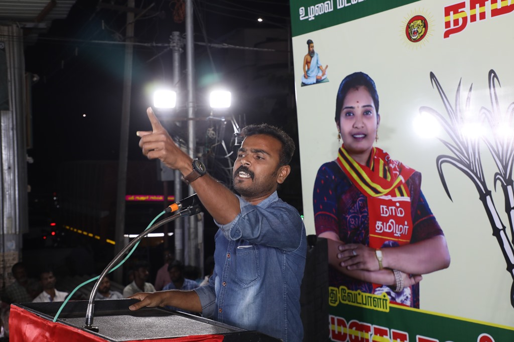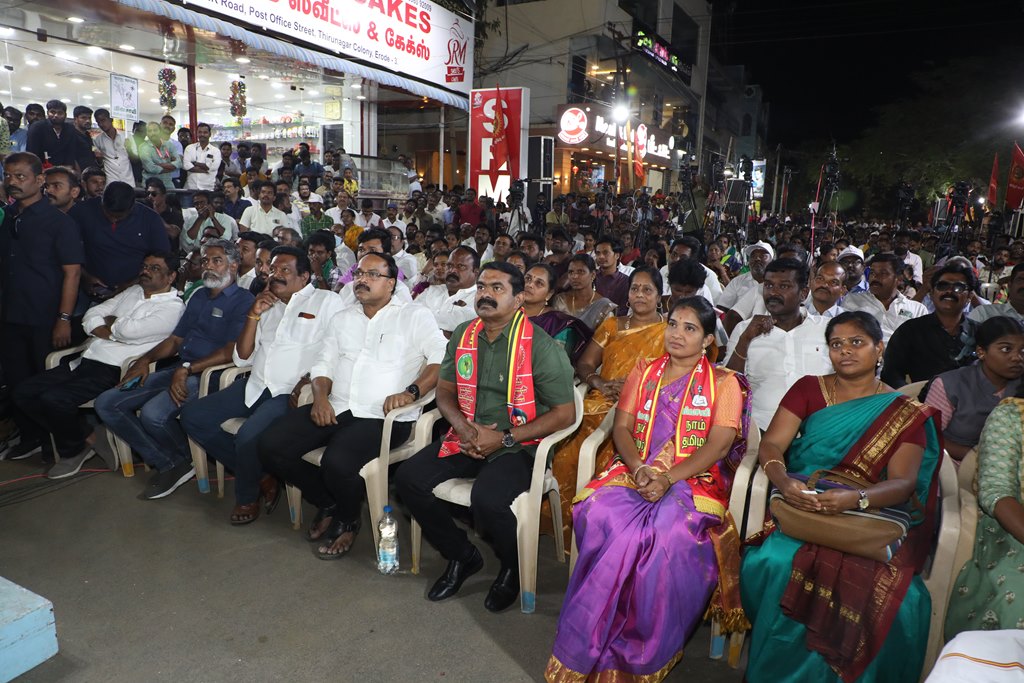 எதிர்வரும் பிப்ரவரி 27 அன்று நடைபெறவிருக்கும், ஈரோடு கிழக்கு சட்டமன்றத் தொகுதிக்கான இடைத்தேர்தலில், மக்களின் துணையோடு மாற்று அரசியல் புரட்சியை ஏற்படுத்த தனித்து களம் காணும் நாம் தமிழர் கட்சி சார்பாக போட்டியிடுகின்ற வேட்பாளர் மேனகா நவநீதன் அவர்களை ஆதரித்து, தலைமை ஒருங்கிணைப்பாளர் செந்தமிழன் சீமான் அவர்களின் தலைமையில் 13-02-2023 அன்று மாலை 04 மணியளவில் ஈரோடு திருநகர் காலனி பகுதியில் மாபெரும் பரப்புரைப் பொதுக்கூட்டம் நடைபெற்றது.