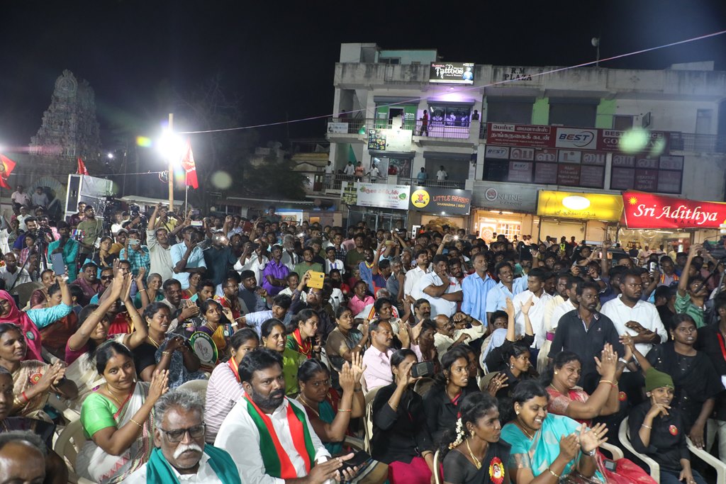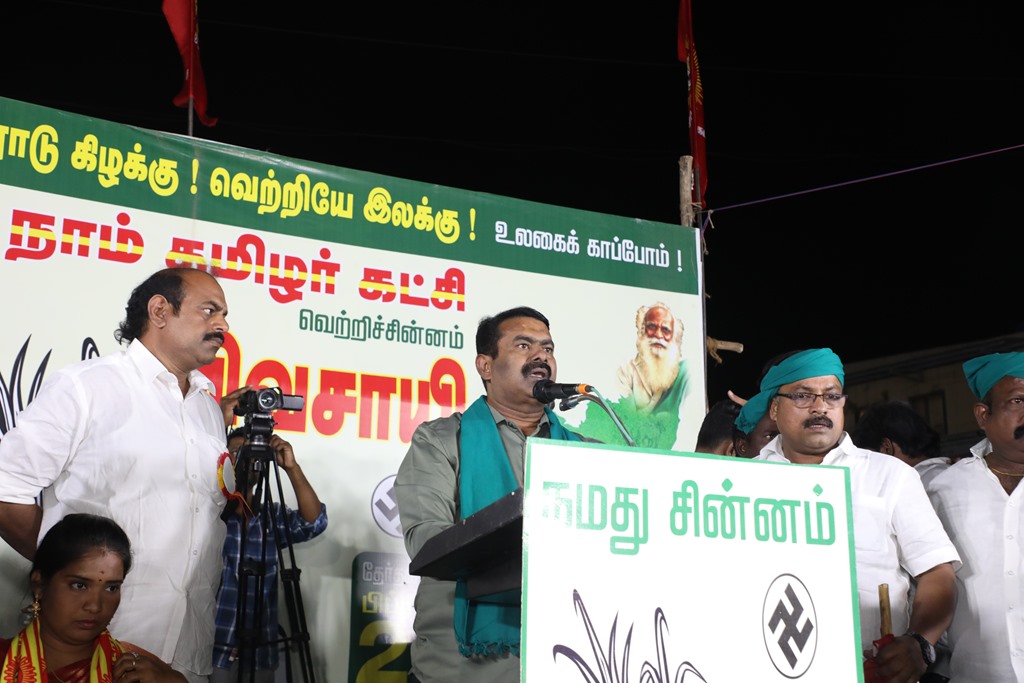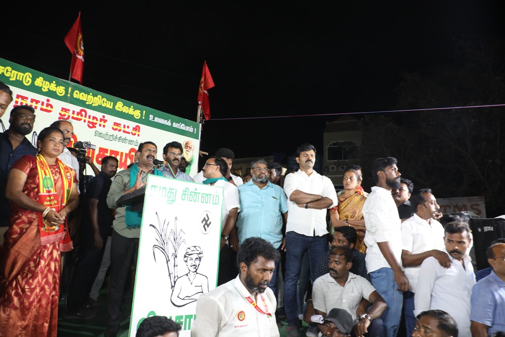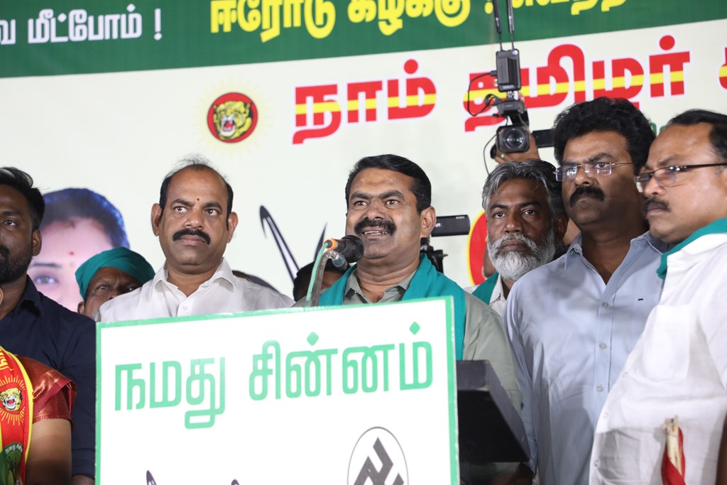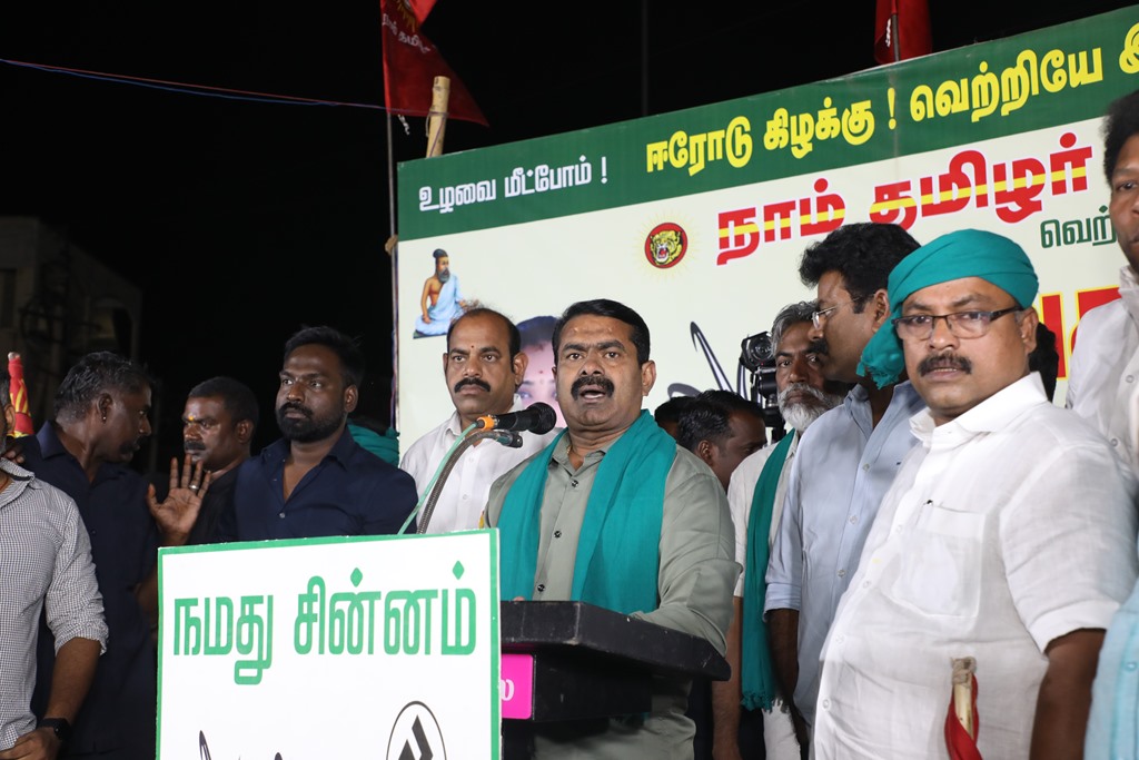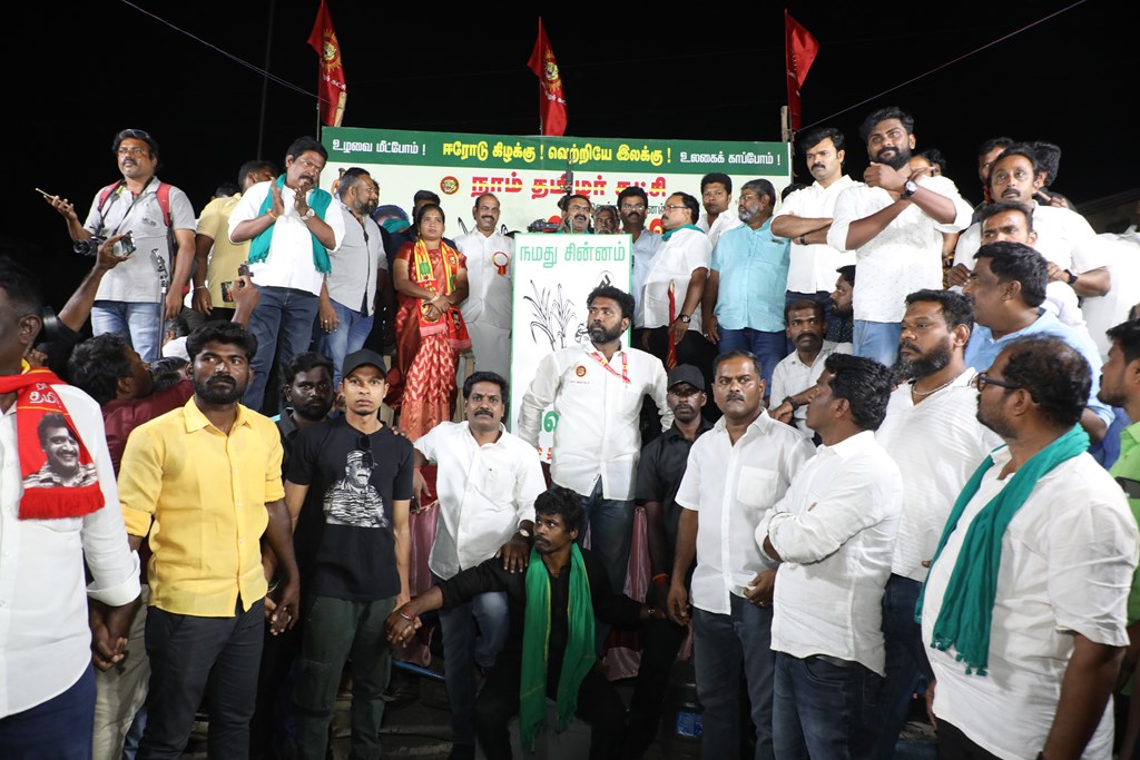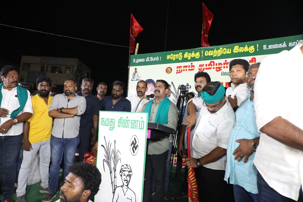 எதிர்வரும் பிப்ரவரி 27 அன்று நடைபெறவிருக்கும், ஈரோடு கிழக்கு சட்டமன்றத் தொகுதிக்கான இடைத்தேர்தலில், மக்களின் துணையோடு மாற்று அரசியல் புரட்சியை ஏற்படுத்த தனித்து களம் காணும் நாம் தமிழர் கட்சி சார்பாக போட்டியிடுகின்ற வேட்பாளர் மேனகா நவநீதன் அவர்களை ஆதரித்து, தலைமை ஒருங்கிணைப்பாளர் செந்தமிழன் சீமான் அவர்களின் தலைமையில் 22-02-2023 அன்று மாலை 04 மணியளவில் ஈரோடு வீரப்பன் சத்திரம் பேருந்து நிறுத்தம் பகுதியில் மாபெரும் பரப்புரைப் பொதுக்கூட்டம் நடைபெற்றது.