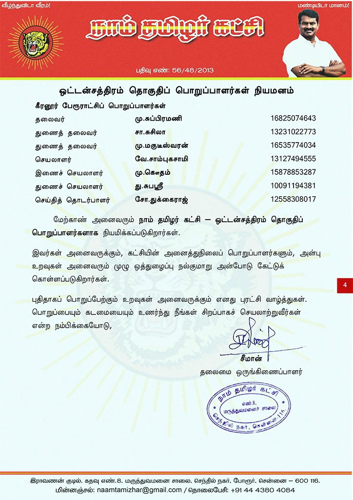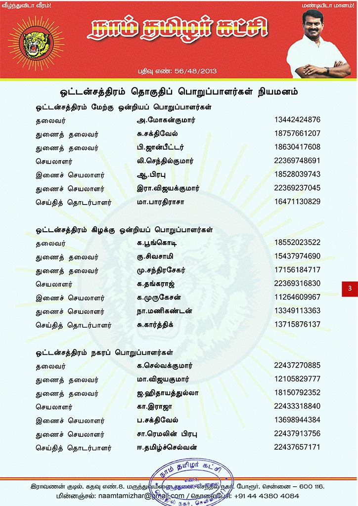 இவர்கள் அனைவருக்கும், கட்சியின் அனைத்துநிலைப் பொறுப்பாளர்களும், அன்பு உறவுகள் அனைவரும் முழு ஒத்துழைப்பு நல்குமாறு அன்போடு கேட்டுக் கொள்ளப்படுகிறார்கள்.