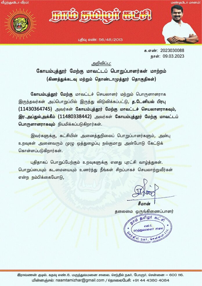 கோயம்புத்தூர் மேற்கு மாவட்டச் செயலாளர் மற்றும் பொருளாளராக இருந்தவர்கள் அப்பொறுப்பில் இருந்து விடுவிக்கப்பட்டு, த.டேனியல் பிரபு (11430364745) அவர்கள் கோயம்புத்தூர் மேற்கு மாவட்டச் செயலாளராகவும், இர.அப்துல்அக்கீம் (11480338442) அவர்கள் கோயம்புத்தூர் மேற்கு மாவட்டப் பொருளாளராகவும் நியமிக்கப்படுகிறார்கள்.