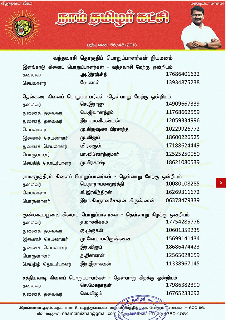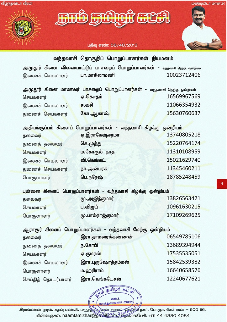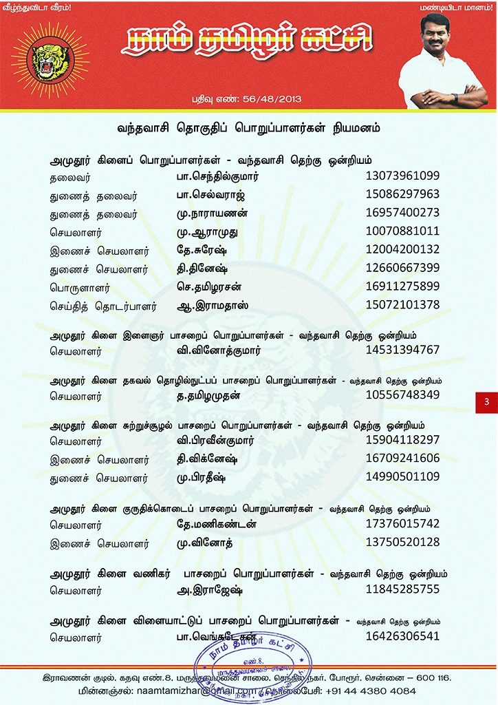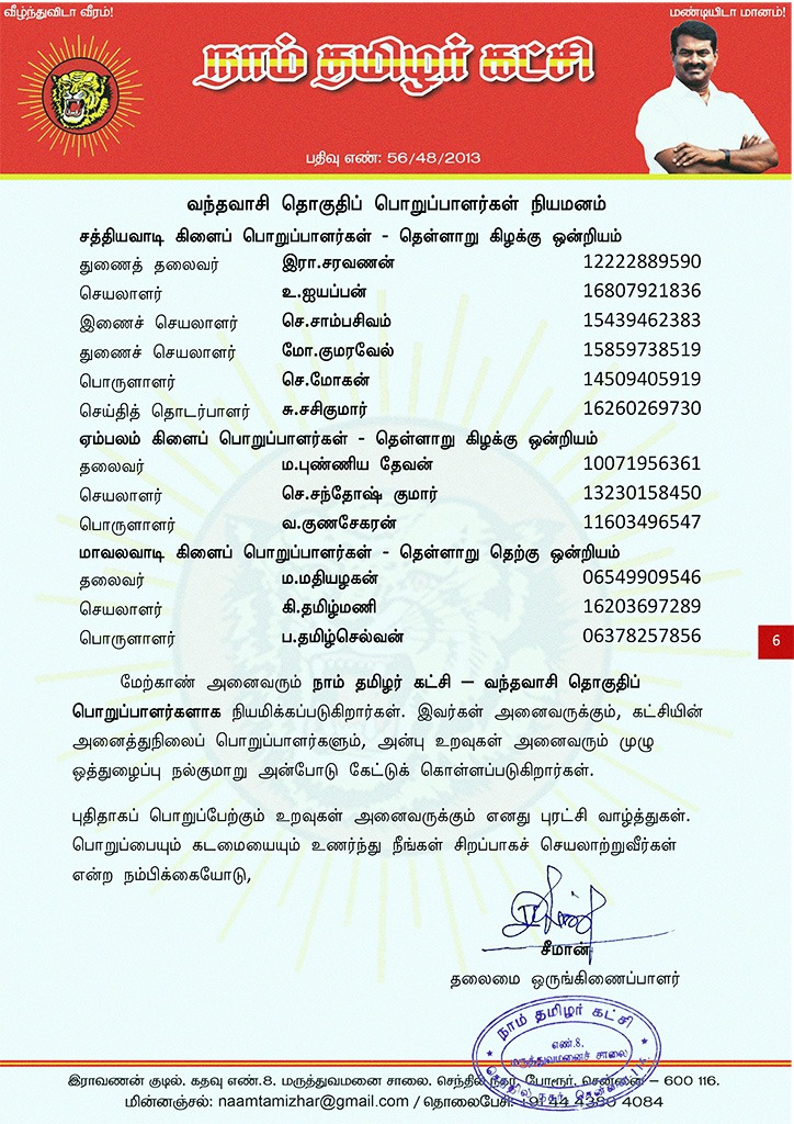 மேற்காண் அனைவரும் நாம் தமிழர் கட்சி – வந்தவாசி தொகுதிப் பொறுப்பாளர்களாக நியமிக்கப்படுகிறார்கள். இவர்கள் அனைவருக்கும், கட்சியின் அனைத்துநிலைப் பொறுப்பாளர்களும், அன்பு உறவுகள் அனைவரும் முழு ஒத்துழைப்பு நல்குமாறு அன்போடு கேட்டுக் கொள்ளப்படுகிறார்கள்.